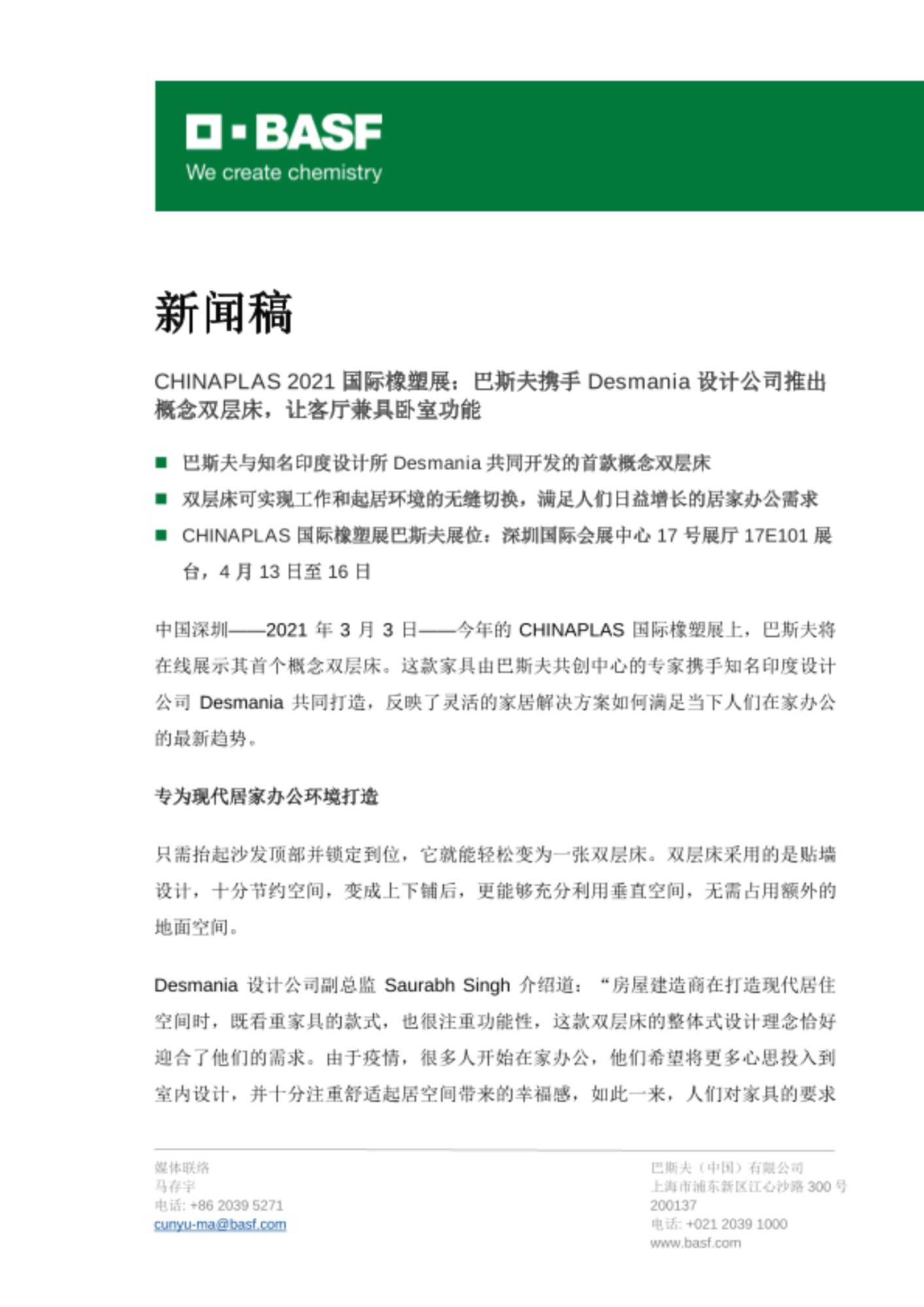 中国深圳——2021 年 3 月 3 日——今年的 CHINAPLAS 国际橡塑展上,巴斯夫将在线展示其首个概念双层床。这款家具由巴斯夫共创中心的专家携手知名印度设计公司 Desmania 共同打造,反映了灵活的家居解决方案如何满足当下人们在家办公的最新趋势。