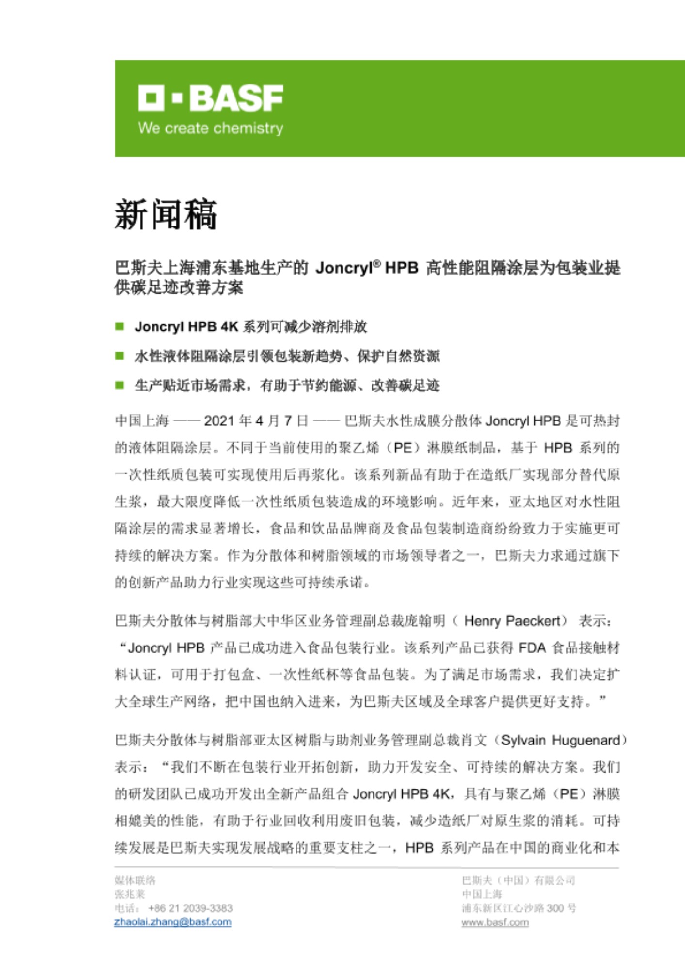 中国上海 —— 2021 年 4 月 7 日 —— 巴斯夫水性成膜分散体 Joncryl HPB 是可热封的液体阻隔涂层。不同于当前使用的聚乙烯(PE)淋膜纸制品,基于 HPB 系列的一次性纸质包装可实现使用后再浆化。该系列新品有助于在造纸厂实现部分替代原生浆,最大限度降低一次性纸质包装造成的环境影响。近年来,亚太地区对水性阻隔涂层的需求显著增长,食品和饮品品牌商及食品包装制造商纷纷致力于实施更可持续的解决方案。作为分散体和树脂领域的市场领导者之一,巴斯夫力求通过旗下的创新产品助力行业实现这些可持续承诺。
