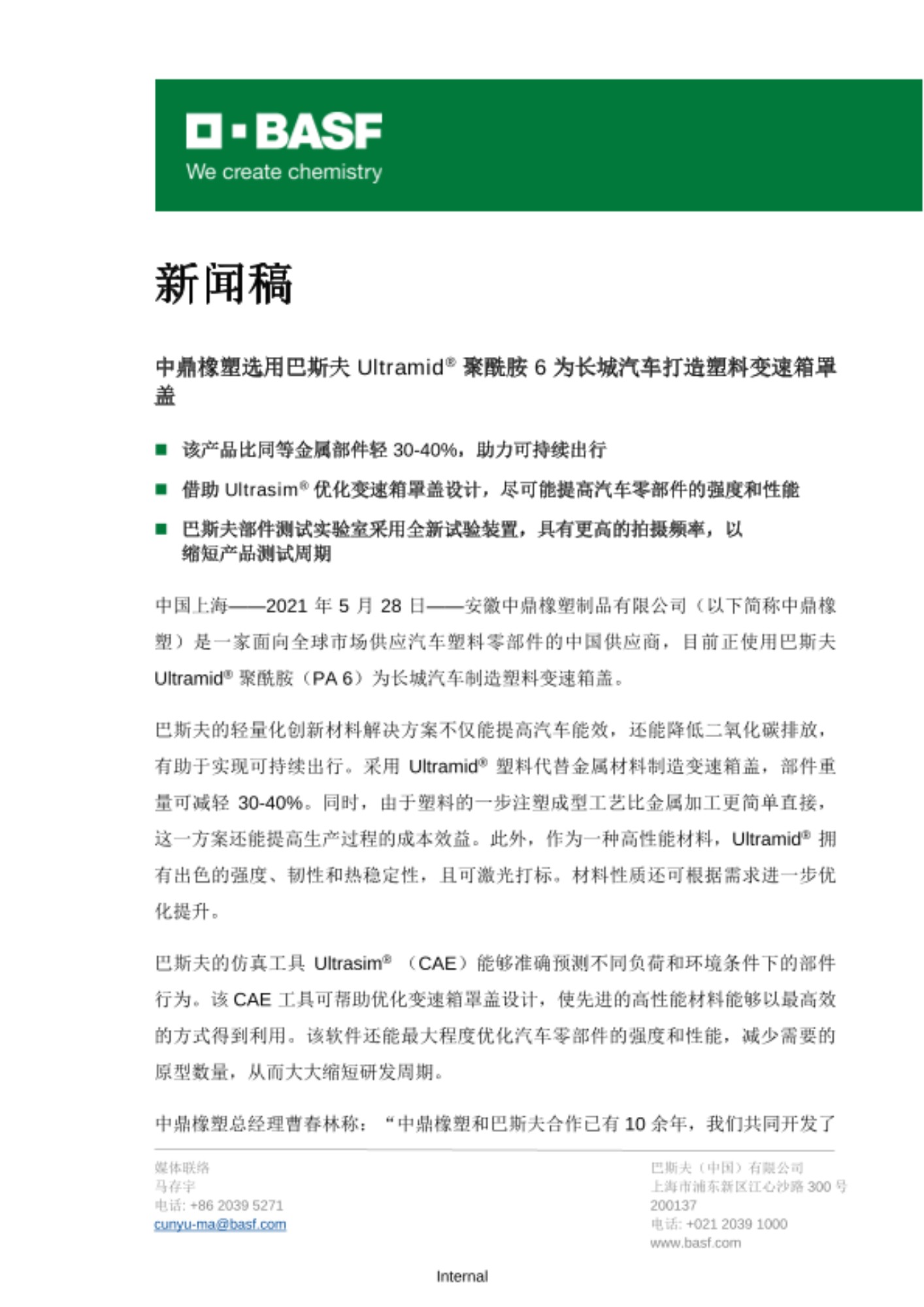 中国上海——2021 年 5 月 28 日——安徽中鼎橡塑制品有限公司(以下简称中鼎橡塑)是一家面向全球市场供应汽车塑料零部件的中国供应商,目前正使用巴斯夫 Ultramid® 聚酰胺(PA 6)为长城汽车制造塑料变速箱盖。