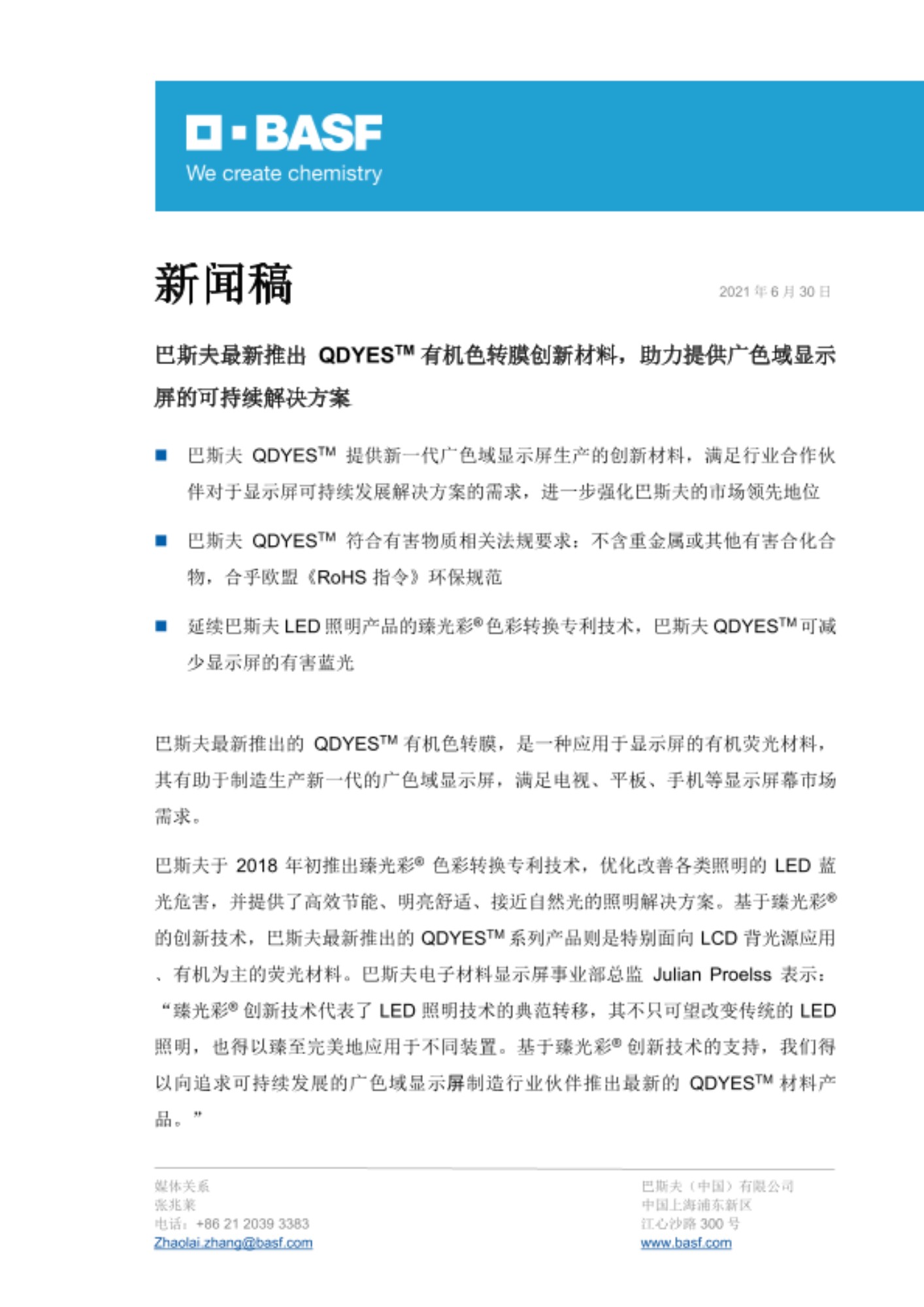 巴斯夫于2018年初推出臻光彩® 色彩转换专利技术,优化改善各类照明的LED蓝光危害,并提供了高效节能、明亮舒适、接近自然光的照明解决方案。基于臻光彩® 的创新技术,巴斯夫最新推出的QDYESTM系列产品则是特别面向LCD背光源应用﹑有机为主的荧光材料。巴斯夫电子材料显示屏事业部总监Julian Proelss表示:“臻光彩® 创新技术代表了LED照明技术的典范转移,其不只可望改变传统的LED照明,也得以臻至完美地应用于不同装置。基于臻光彩® 创新技术的支持,我们得以向追求可持续发展的广色域显示屏制造行业伙伴推出最新的QDYESTM材料产品。”