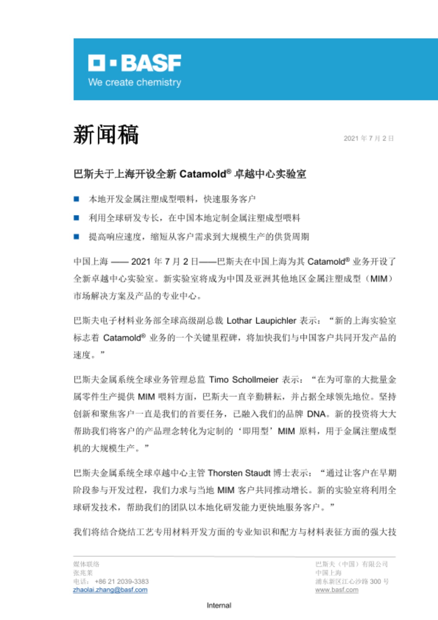 中国上海 —— 2021 年 7月 2日——巴斯夫在中国上海为其 Catamold® 业务开设了全新卓越中心实验室。新实验室将成为中国及亚洲其他地区金属注塑成型(MIM)市场解决方案及产品的专业中心。