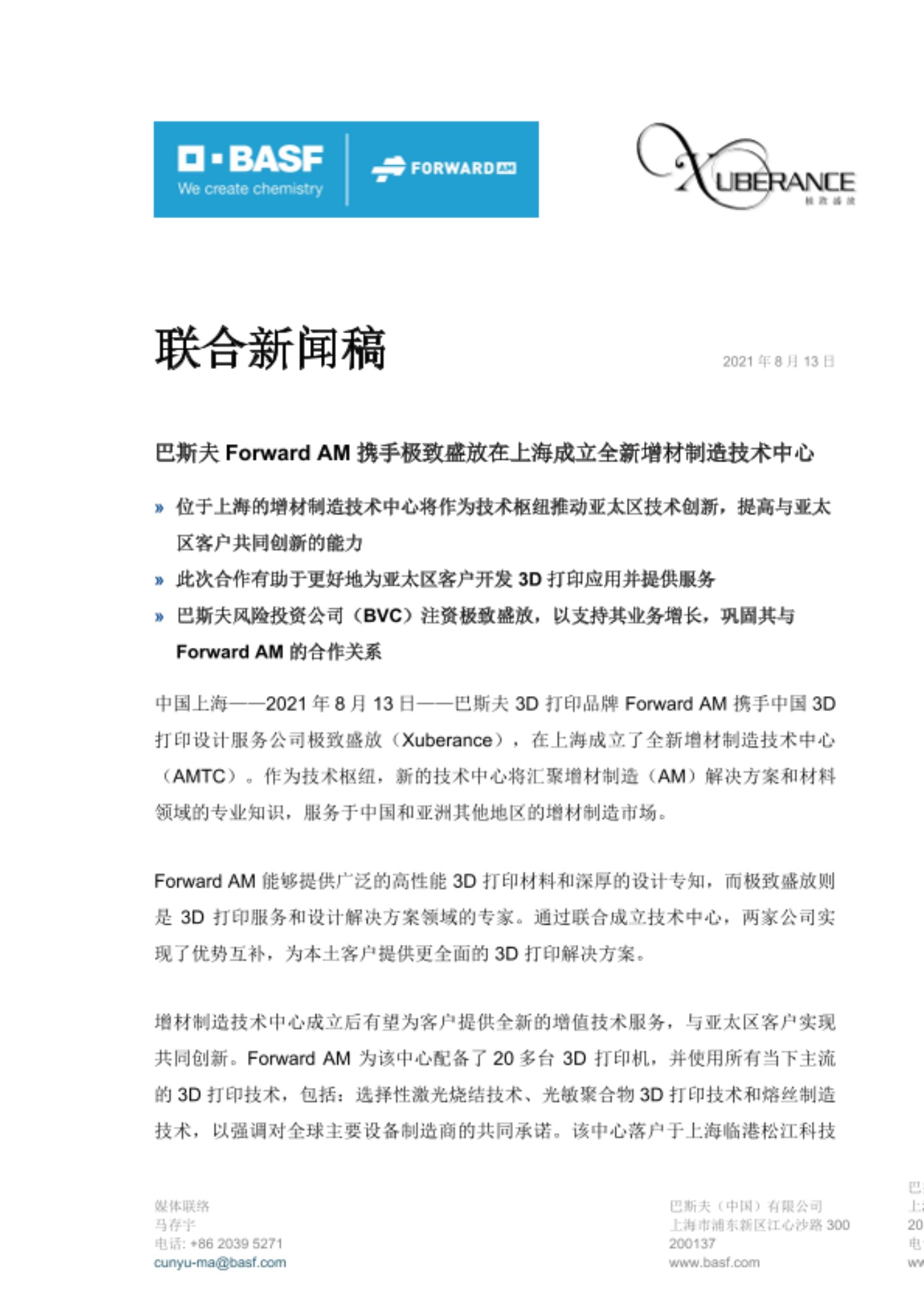 中国上海——2021年8月13日——巴斯夫 3D 打印品牌 Forward AM 携手中国3D打印设计服务公司极致盛放(Xuberance),在上海成立了全新增材制造技术中心(AMTC)。作为技术枢纽,新的技术中心将汇聚增材制造(AM)解决方案和材料领域的专业知识,服务于中国和亚洲其他地区的增材制造市场。