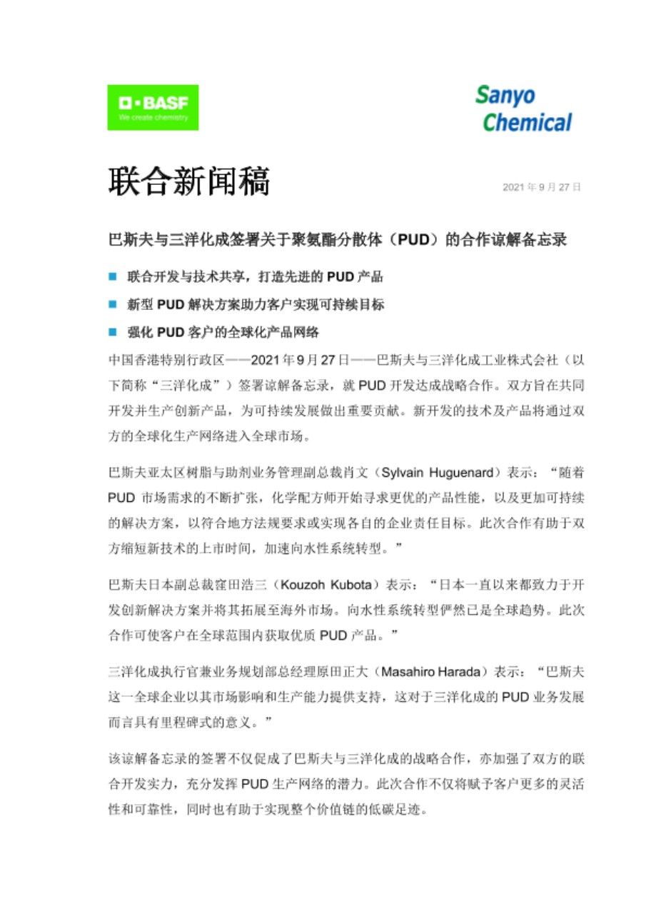 中国香港特别行政区 / 中国上海 ——2021年9月27日——巴斯夫与三洋化成工业株式会社(以下简称“三洋化成”)签署谅解备忘录,就 PUD 开发达成战略合作。双方旨在共同开发并生产创新产品,为可持续发展做出重要贡献。新开发的技术及产品将通过双方的全球化生产网络进入全球市场。
