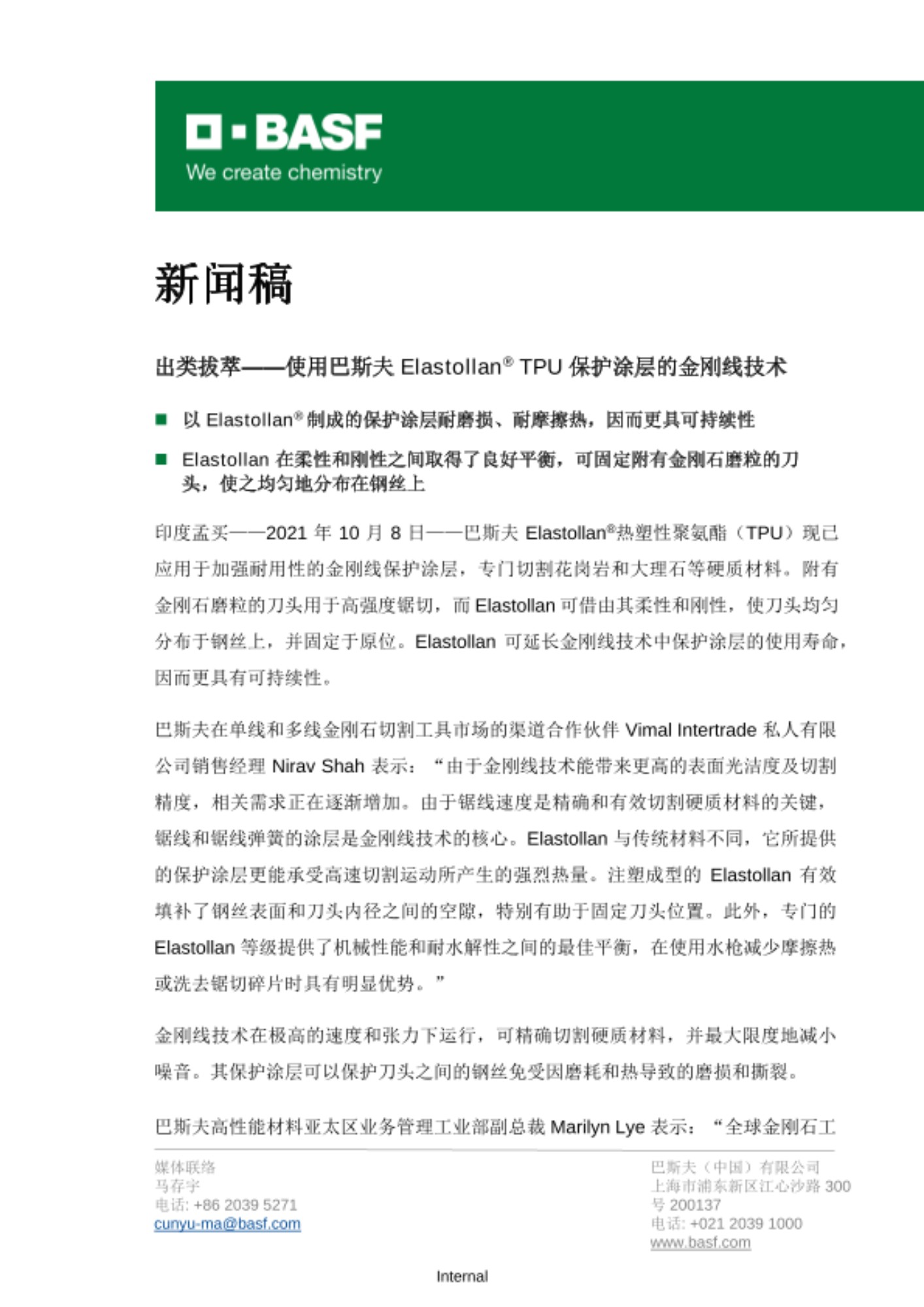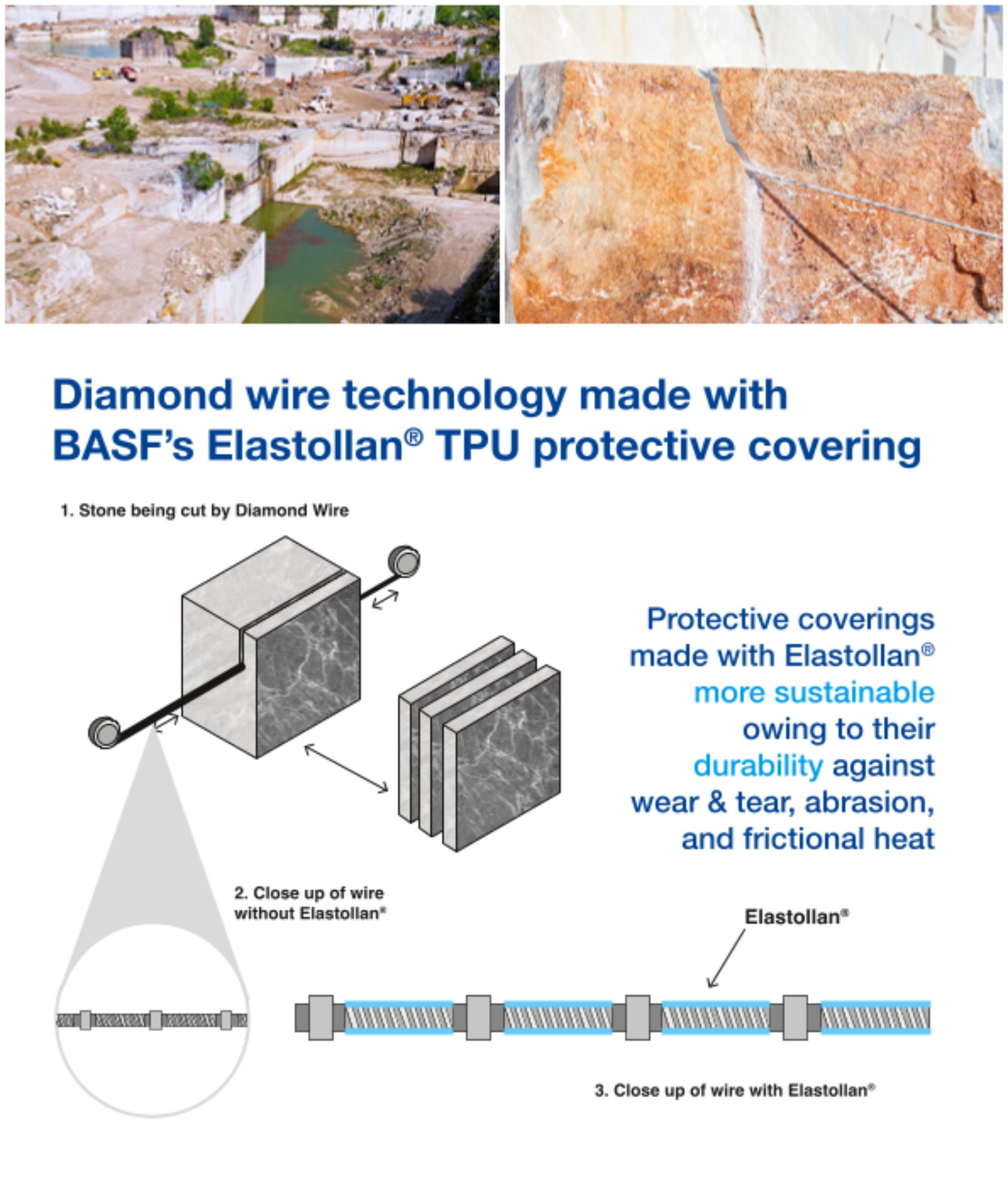印度孟买——2021年10月8日——巴斯夫Elastollan®热塑性聚氨酯(TPU)现已应用于加强耐用性的金刚线保护涂层,专门切割花岗岩和大理石等硬质材料。附有金刚石磨粒的刀头用于高强度锯切,而Elastollan 可借由其柔性和刚性,使刀头均匀分布于钢丝上,并固定于原位。Elastollan 可延长金刚线技术中保护涂层的使用寿命,因而更具有可持续性。