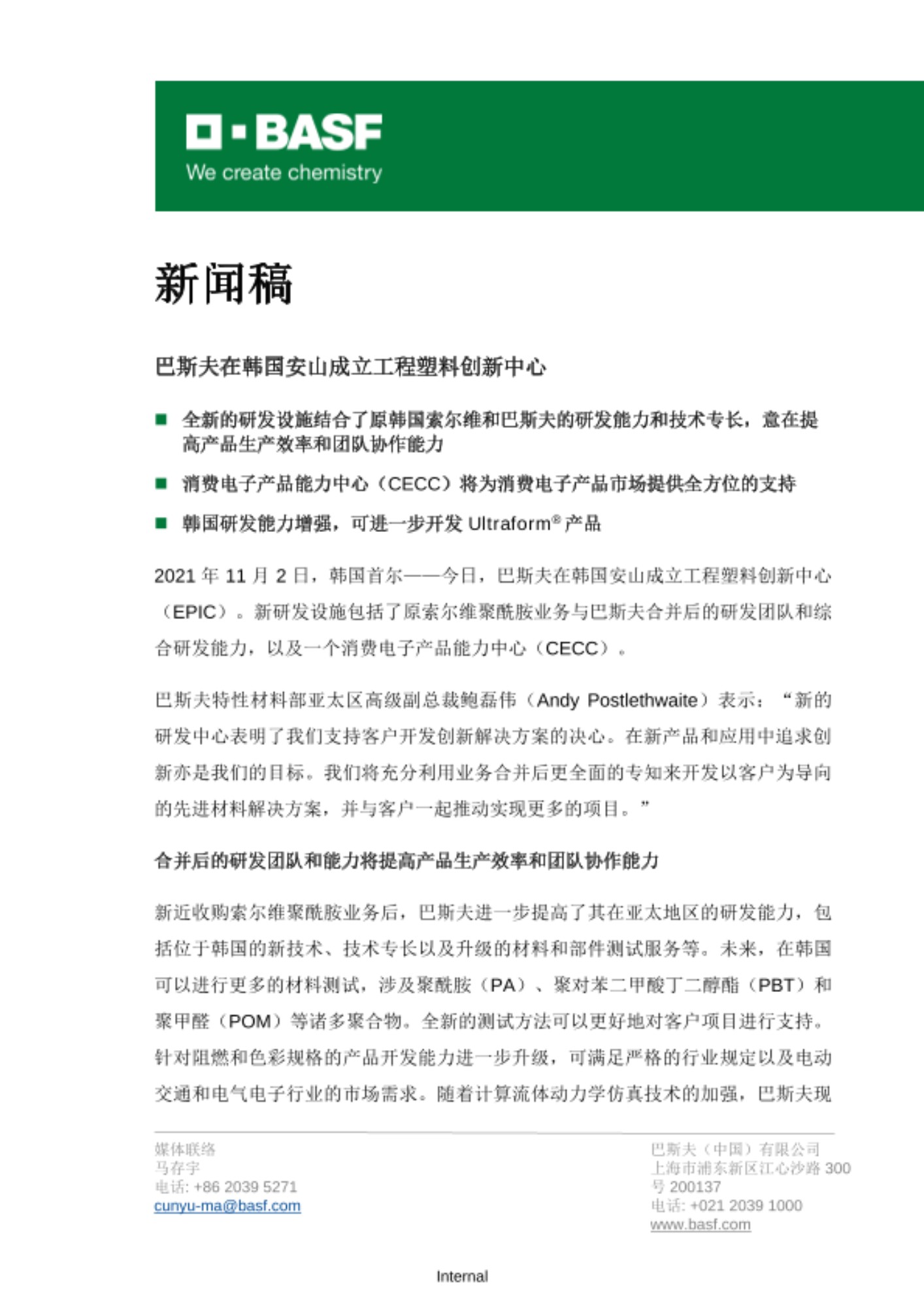 2021年11月2日,韩国首尔——今日,巴斯夫在韩国安山成立工程塑料创新中心(EPIC)。新研发设施包括了原索尔维聚酰胺业务与巴斯夫合并后的研发团队和综合研发能力,以及一个消费电子产品能力中心(CECC)。