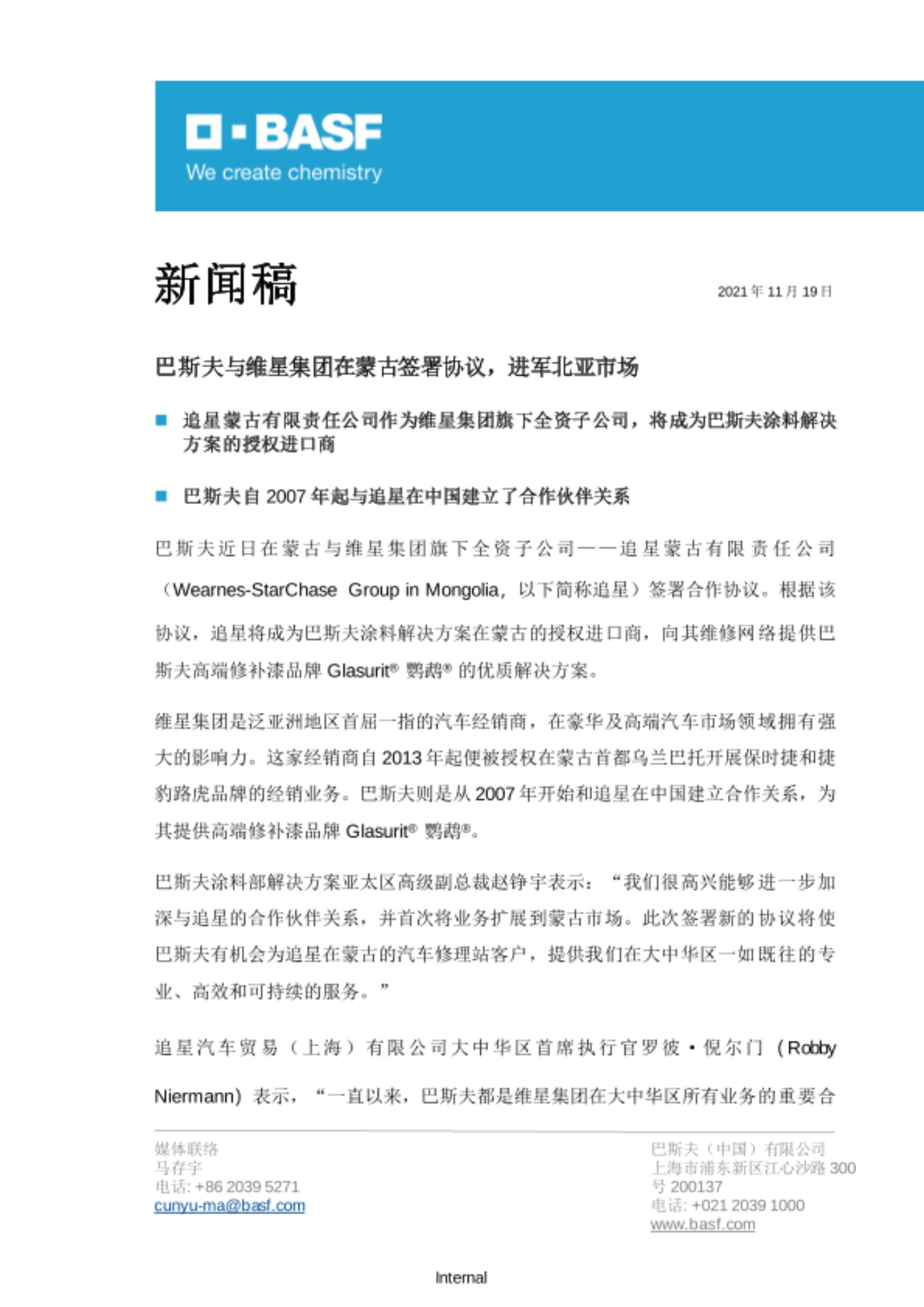 追星汽车贸易(上海)有限公司大中华区首席执行官罗彼·倪尔门(Robby Niermann)表示,“一直以来,巴斯夫都是维星集团在大中华区所有业务的重要合作伙伴。我们在中国和保时捷中心合作,成功地率先推出了鹦鹉®(Glasurit®)100 系列,并在赛车运动中通过强大的营销合作获益良多。巴斯夫现在与我们进一步加强合作,把蒙古市场的进口商责任交付予我们,这让我们感到自豪。”