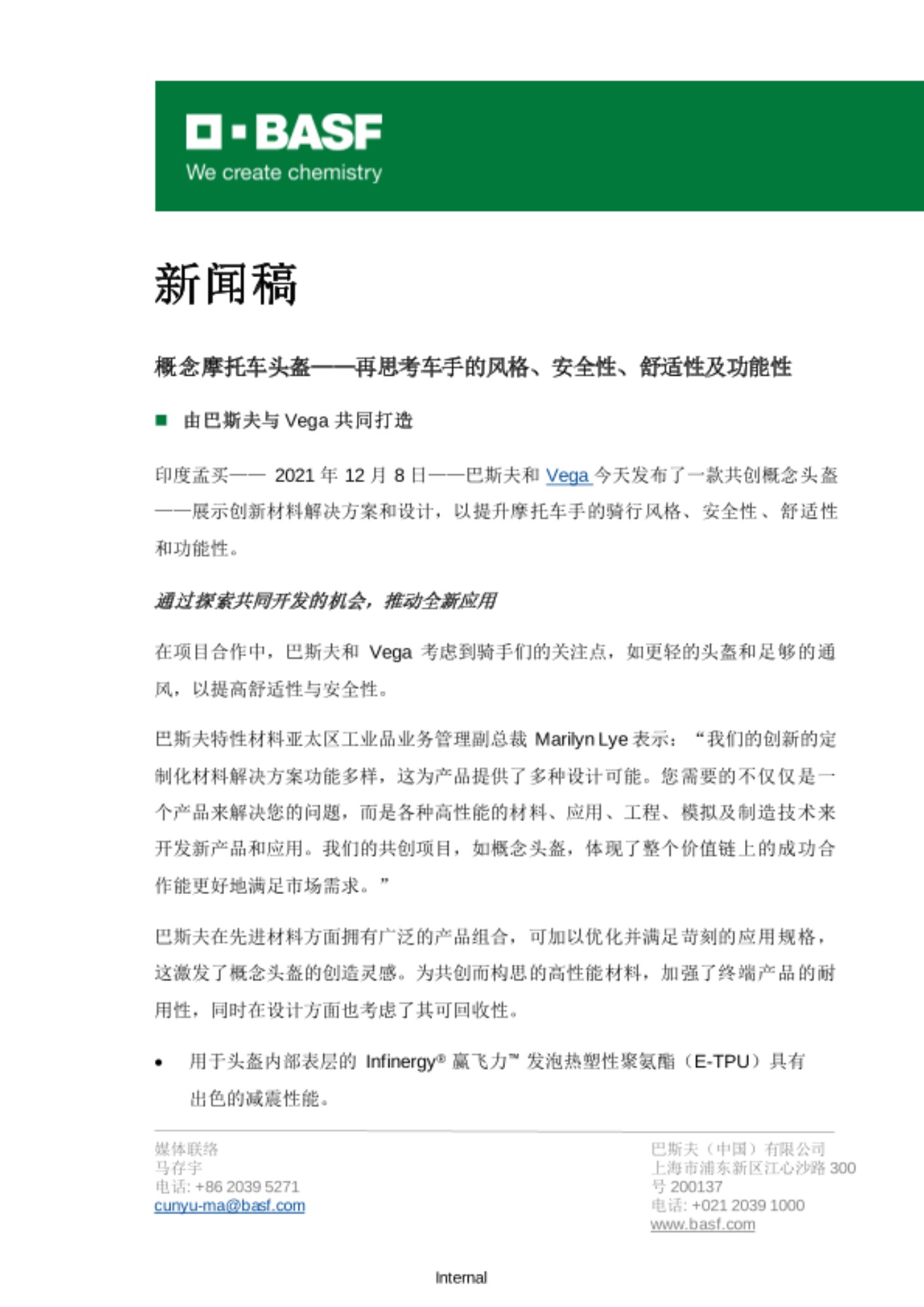 位于贝尔高姆的Vega 汽车配件有限公司研发总监Uttam Chandak表示:“Vega 一直以来是众多自行车和两轮车骑手的首选,30 多年来为他们提供安全与质量保障。我们很高兴通过与巴斯夫的合作,向头盔行业引入新的概念。通过和巴斯夫的功能与创意设计,我们将探索头盔技术和材料创新及安全性的新领域,携手向我们的使命前进。”