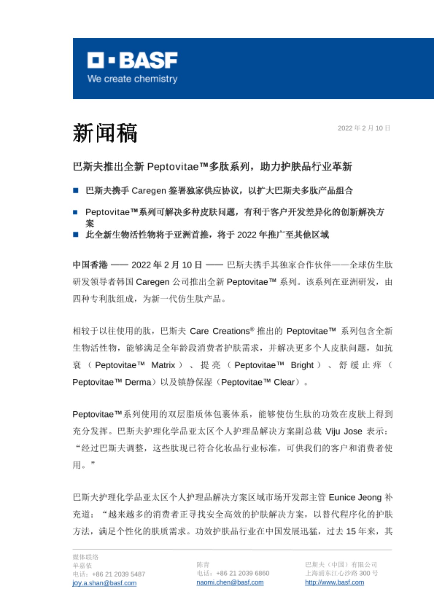 中国香港 —— 2022年2月10日 —— 巴斯夫携手其独家合作伙伴——全球仿生肽研发领导者韩国 Caregen 公司推出全新 Peptovitae™ 系列。该系列在亚洲研发,由四种专利肽组成,为新一代仿生肽产品。