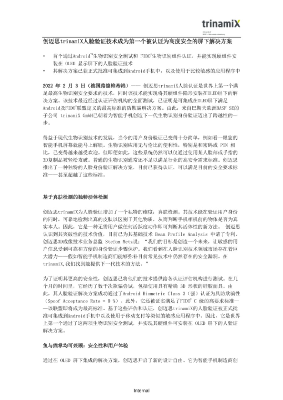 2022 年 2 月 3 日(德国路德维希港)—— 创迈思trinamiX人脸认证是世界上第一个满足最高生物识别安全要求的技术,同时该技术能实现将其硬组件隐形安装在OLED屏下的解决方案。该技术最近经过认证评估机构的全面测试,已证明是可集成在OLED屏下满足 Android及FIDO®联盟定义的最高标准的防欺骗解决方案。由此,来自巴斯夫欧洲BASF SE的子公司 trinamiX GmbH已朝着为智能手机创造下一代生物识别身份验证迈出了跨越性的一步。