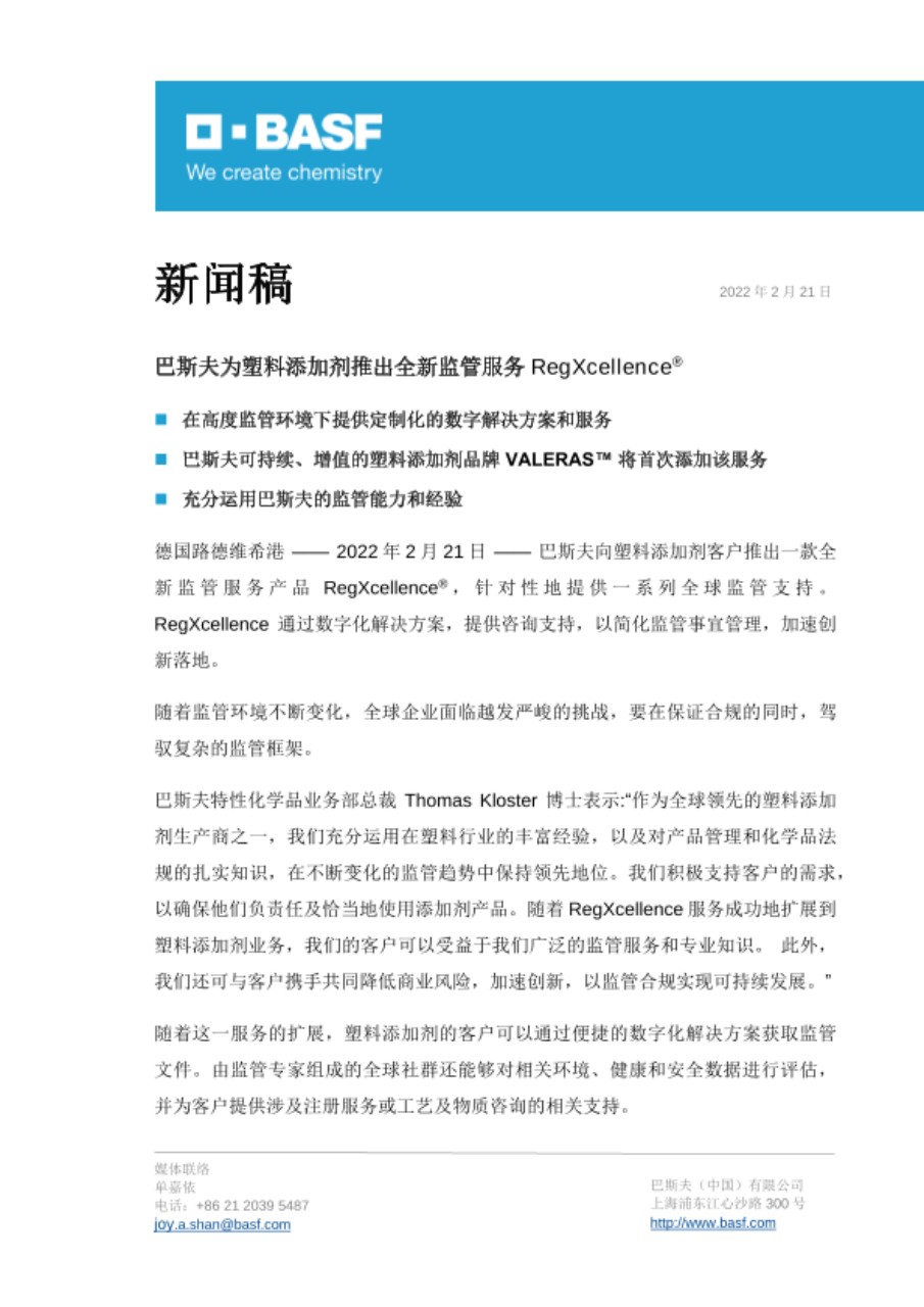 巴斯夫特性化学品业务部总裁 Thomas Kloster 博士表示:“作为全球领先的塑料添加剂生产商之一,我们充分运用在塑料行业的丰富经验,以及对产品管理和化学品法规的扎实知识,在不断变化的监管趋势中保持领先地位。我们积极支持客户的需求,以确保他们负责任及恰当地使用添加剂产品。随着RegXcellence服务成功地扩展到塑料添加剂业务,我们的客户可以受益于我们广泛的监管服务和专业知识。 此外,我们还可与客户携手共同降低商业风险,加速创新,以监管合规实现可持续发展。”