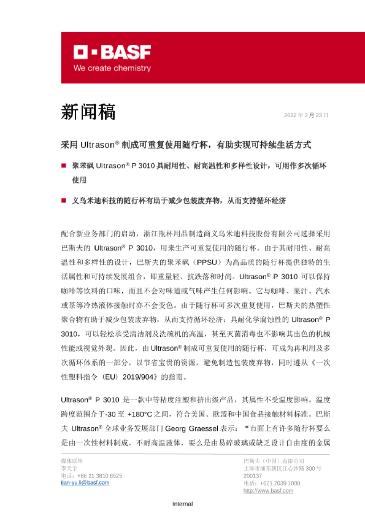 配合新业务部门的启动,浙江瓶杯用品制造商义乌米迪科技股份有限公司选择采用巴斯夫的Ultrason® P 3010,用来生产可重复使用的随行杯。由于其耐用性、耐高温性和多样性的设计,巴斯夫的聚苯砜(PPSU)为高品质的随行杯提供独特的生活属性和可持续发展组合,即重量轻、抗跌落和时尚。Ultrason® P 3010可以保持咖啡等饮料的口味,而且不会对味道或气味产生任何影响。它与咖啡、果汁、汽水或茶等冷热液体接触时亦不会变色。由于随行杯可多次重复使用,巴斯夫的热塑性聚合物有助于减少包装废弃物,从而支持循环经济:具耐化学腐蚀性的Ultrason® P 3010,可以轻松承受清洁剂及洗碗机的高温,甚至灭菌消毒也不影响其出色的机械性能或视觉外观。因此,由Ultrason® 制成可重复使用的随行杯,可成为再利用及多次循环体系的一部分,以节省宝贵的资源,避免制造包装废弃物,同时遵从《一次性塑料指令 (EU) 2019/904》的指南。