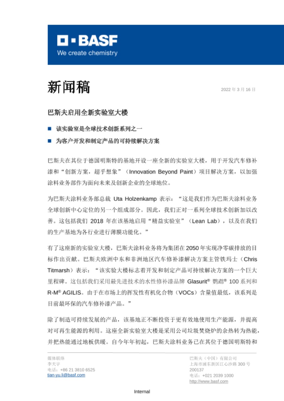 巴斯夫在其位于德国明斯特的基地开设一座全新的实验室大楼,用于开发汽车修补漆和“创新方案,超乎想象”(Innovation Beyond Paint)项目解决方案,以加强涂料业务部作为面向未来及创新企业的全球地位。