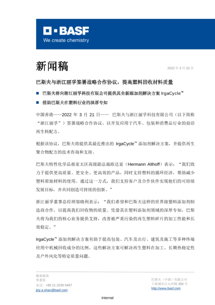 中国香港——2022年3月21日—— 巴斯夫与浙江丽孚科技有限公司(以下简称“浙江丽孚”)签署战略合作协议,以开发应用于汽车、包装和消费品行业的前沿再生料配方。