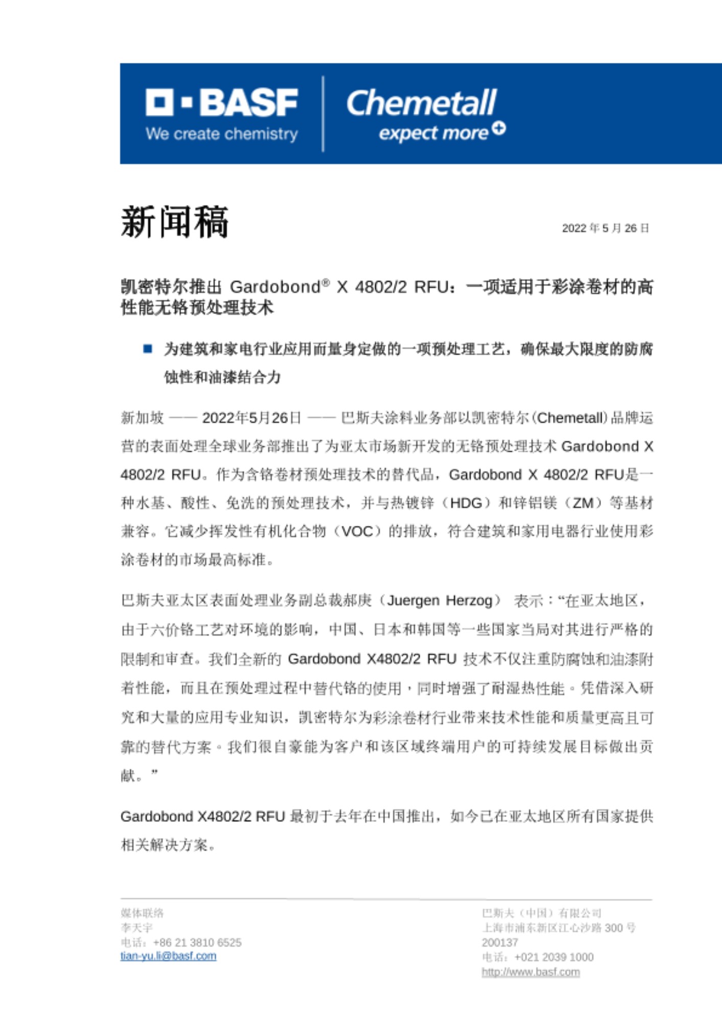 巴斯夫亚太区表面处理业务副总裁郝庚(Juergen Herzog) 表示:“在亚太地区,由于六价铬工艺对环境的影响,中国、日本和韩国等一些国家当局对其进行严格的限制和审查。我们全新的 Gardobond X4802/2 RFU 技术不仅注重防腐蚀和油漆附着性能,而且在预处理过程中替代铬的使用,同时增强了耐湿热性能。凭借深入研究和大量的应用专业知识,凯密特尔为彩涂卷材行业带来技术性能和质量更高且可靠的替代方案。我们很自豪能为客户和该区域终端用户的可持续发展目标做出贡献。”