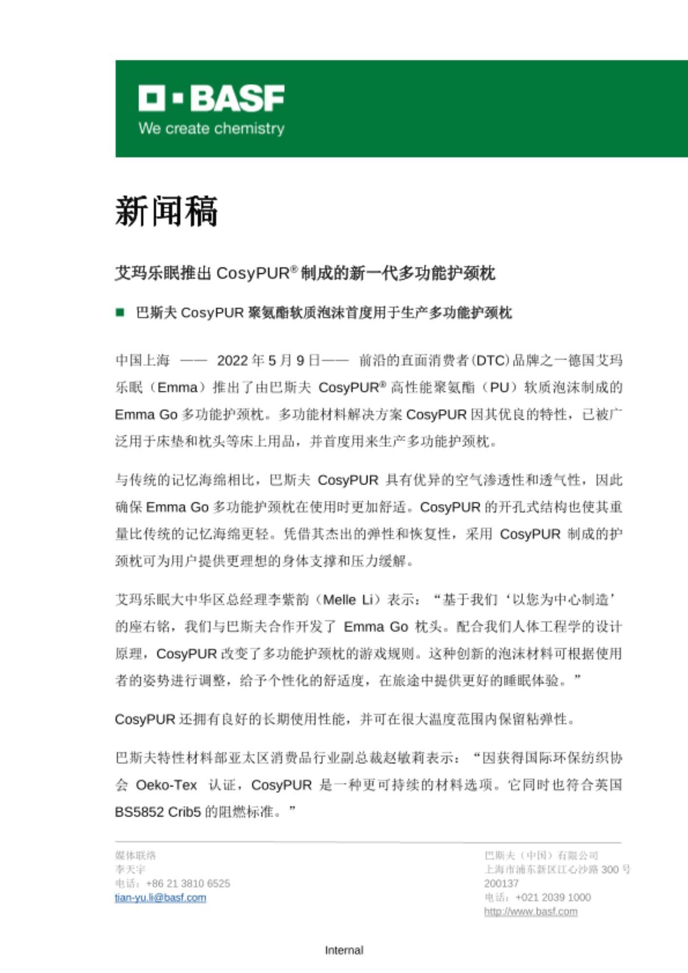 中国上海 —— 2022年5月9日—— 前沿的直面消费者(DTC)品牌之一德国艾玛乐眠(Emma)推出了由巴斯夫CosyPUR® 高性能聚氨酯(PU)软质泡沫制成的Emma Go多功能护颈枕。多功能材料解决方案CosyPUR因其优良的特性,已被广泛用于床垫和枕头等床上用品,并首度用来生产多功能护颈枕。