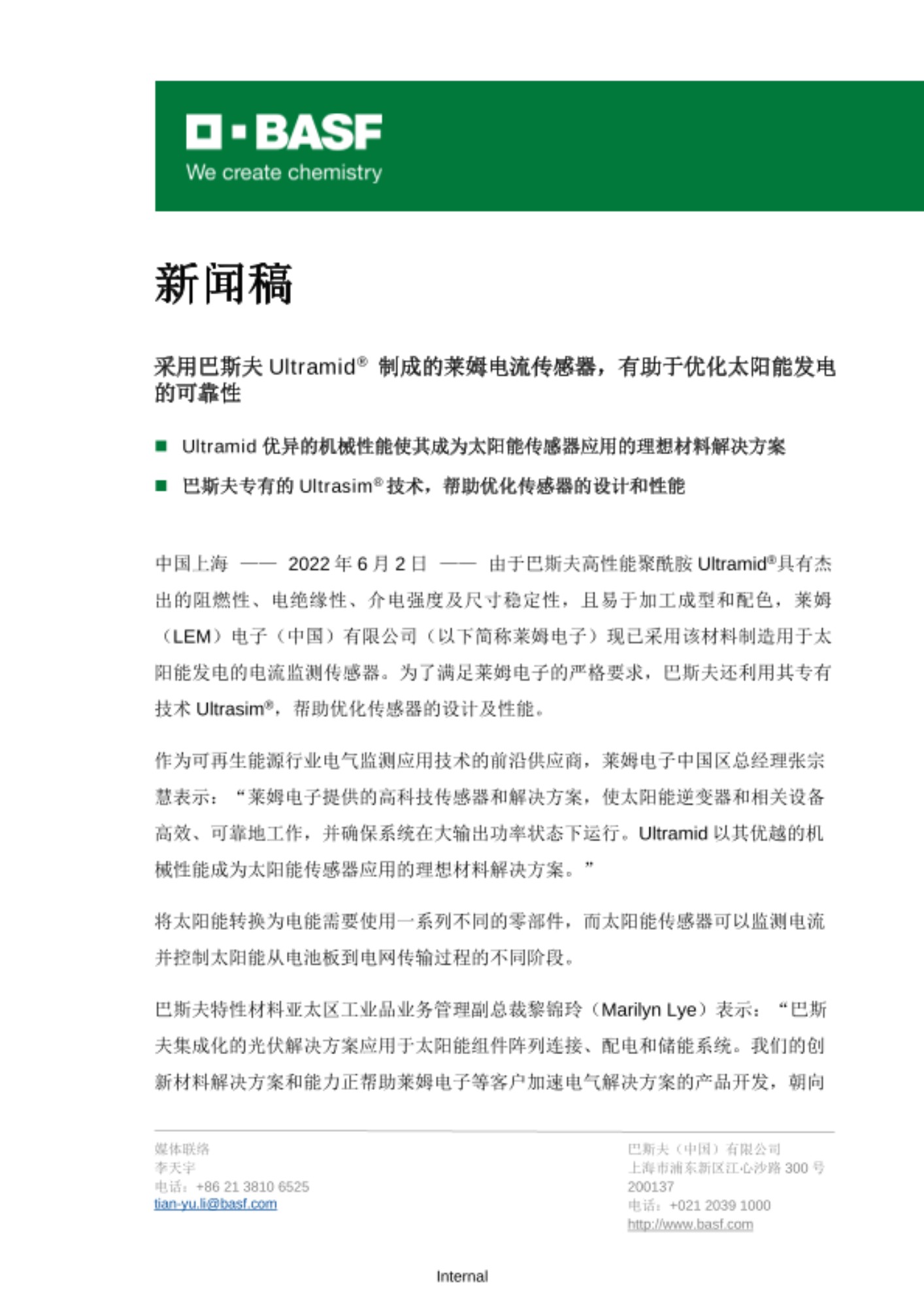 中国上海 —— 2022年6月2日 —— 由于巴斯夫高性能聚酰胺Ultramid®具有杰出的阻燃性、电绝缘性、介电强度及尺寸稳定性,且易于加工成型和配色,莱姆(LEM)电子(中国)有限公司(以下简称莱姆电子)现已采用该材料制造用于太阳能发电的电流监测传感器。为了满足莱姆电子的严格要求,巴斯夫还利用其专有技术Ultrasim®,帮助优化传感器的设计及性能。