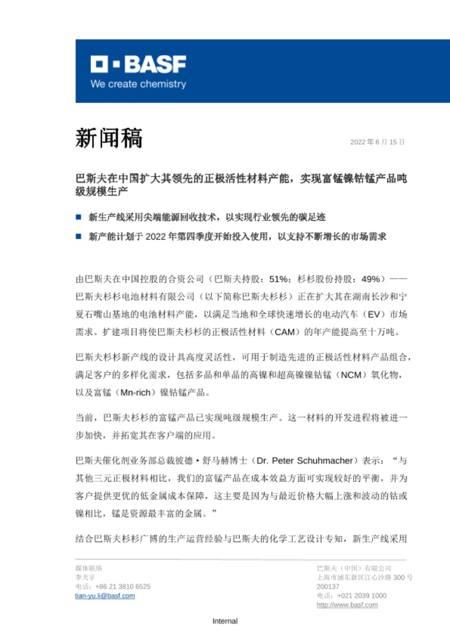 由巴斯夫在中国控股的合资公司(巴斯夫持股:51%;杉杉股份持股:49%)——巴斯夫杉杉电池材料有限公司(以下简称巴斯夫杉杉)正在扩大其在湖南长沙和宁夏石嘴山基地的电池材料产能,以满足当地和全球快速增长的电动汽车(EV)市场需求。扩建项目将使巴斯夫杉杉的正极活性材料(CAM)的年产能提高至十万吨。