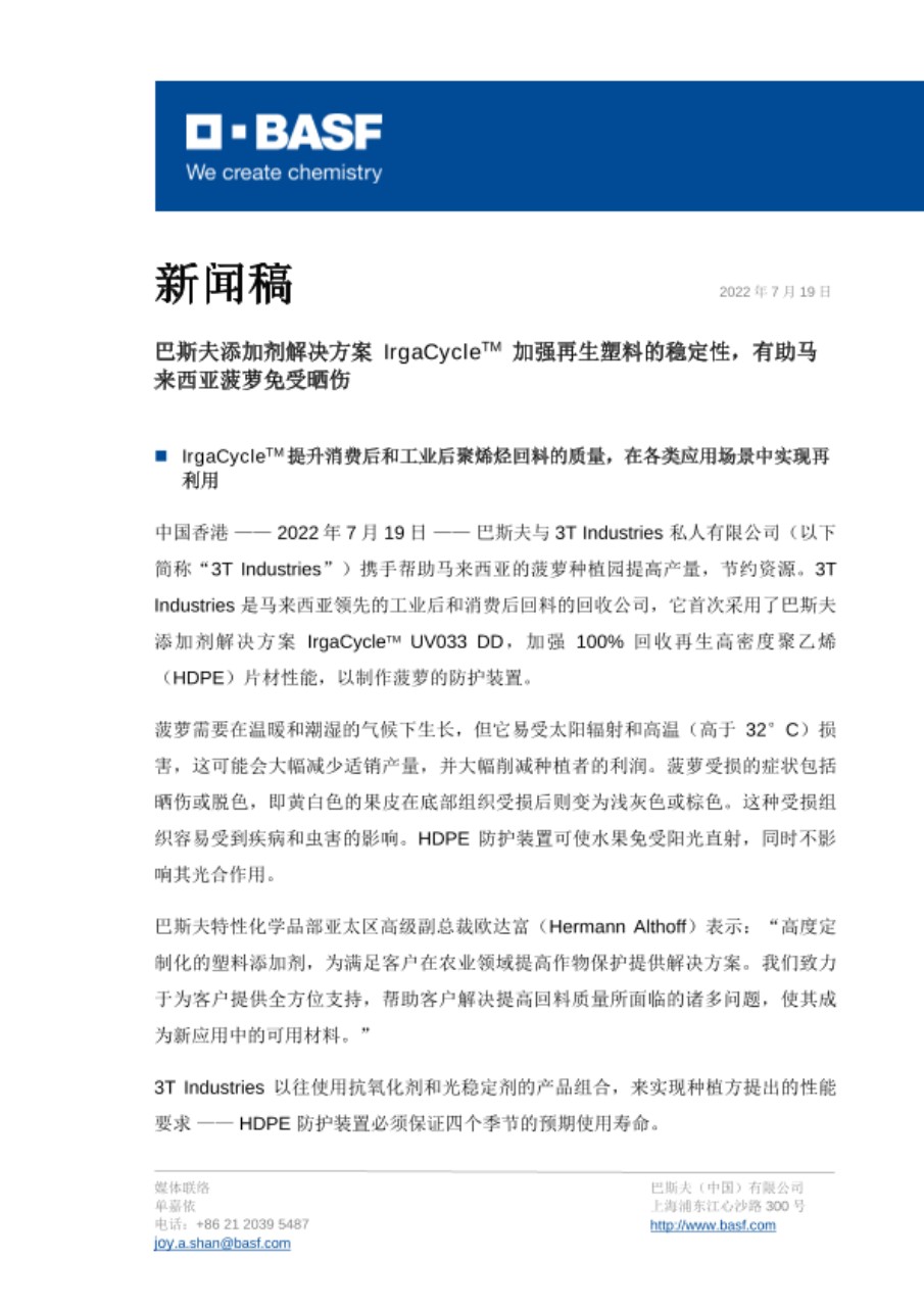 中国香港 —— 2022年7月19日 —— 巴斯夫与 3T Industries 私人有限公司(以下简称“3T Industries”)携手帮助马来西亚的菠萝种植园提高产量,节约资源。3T Industries 是马来西亚领先的工业后和消费后回料的回收公司,它首次采用了巴斯夫添加剂解决方案 IrgaCycleTM UV033 DD,加强100% 回收再生高密度聚乙烯(HDPE)片材性能,以制作菠萝的防护装置。