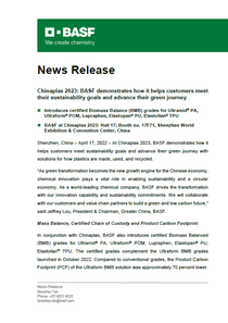 Shenzhen, China – April 17, 2022 – At Chinaplas 2023, BASF demonstrates how it helps customers meet sustainability goals and advance their green journey with solutions for how plastics are made, used, and recycled.
