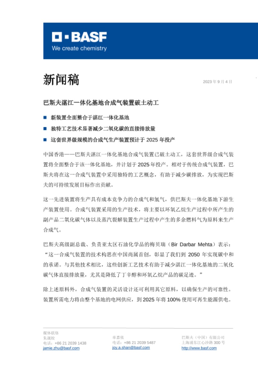巴斯夫高级副总裁、负责亚太区石油化学品的梅贝瑞(Bir Darbar Mehta)表示:“这一合成气装置的技术构思在中国尚属首创,彰显了我们到 2050 年实现碳中和的承诺。与其他技术相比,这些创新工艺技术有助于减少湛江一体化基地的二氧化碳气体直接排放量,尤其是降低了丁辛醇和环氧乙烷产品的碳足迹。”