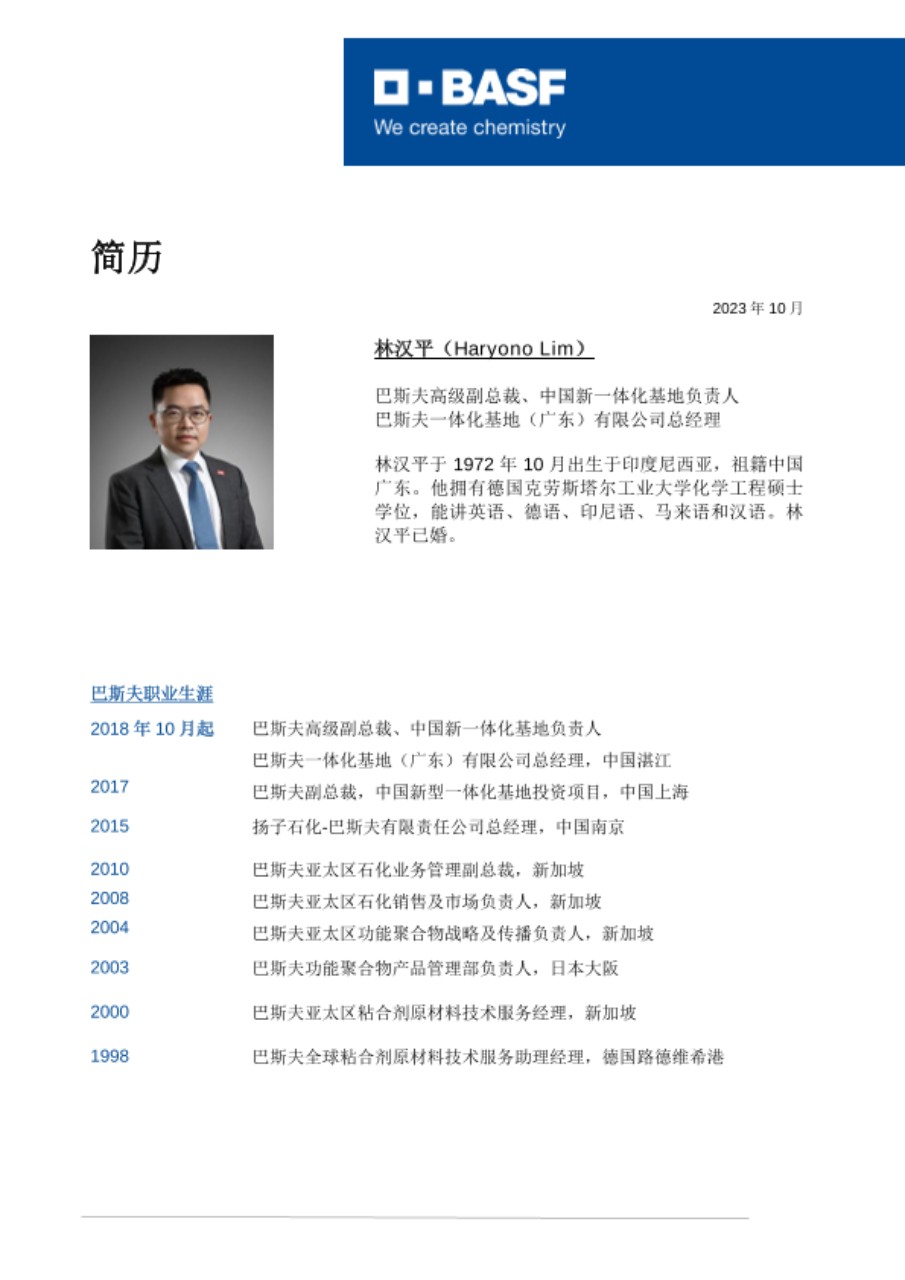 现任巴斯夫高级副总裁、中国新一体化基地负责人兼巴斯夫一体化基地(广东)有限公司总经理林汉平(Haryono Lim,50岁),将于 2024 年 1 月 1 日起出任巴斯夫亚洲大型项目总裁,工作地点为中国湛江。