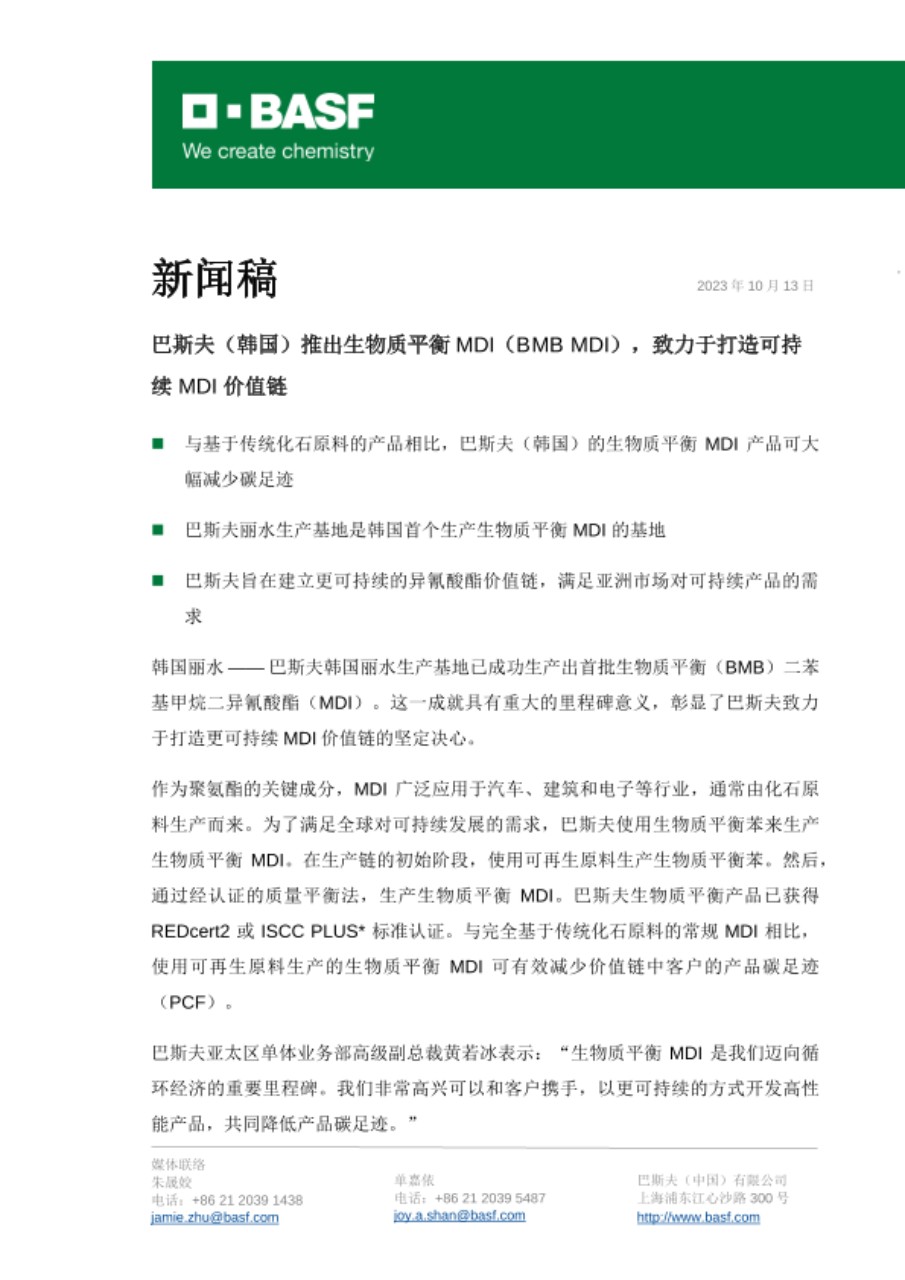 巴斯夫(韩国)推出生物质平衡 MDI(BMB MDI),致力于打造可持续 MDI 价值链