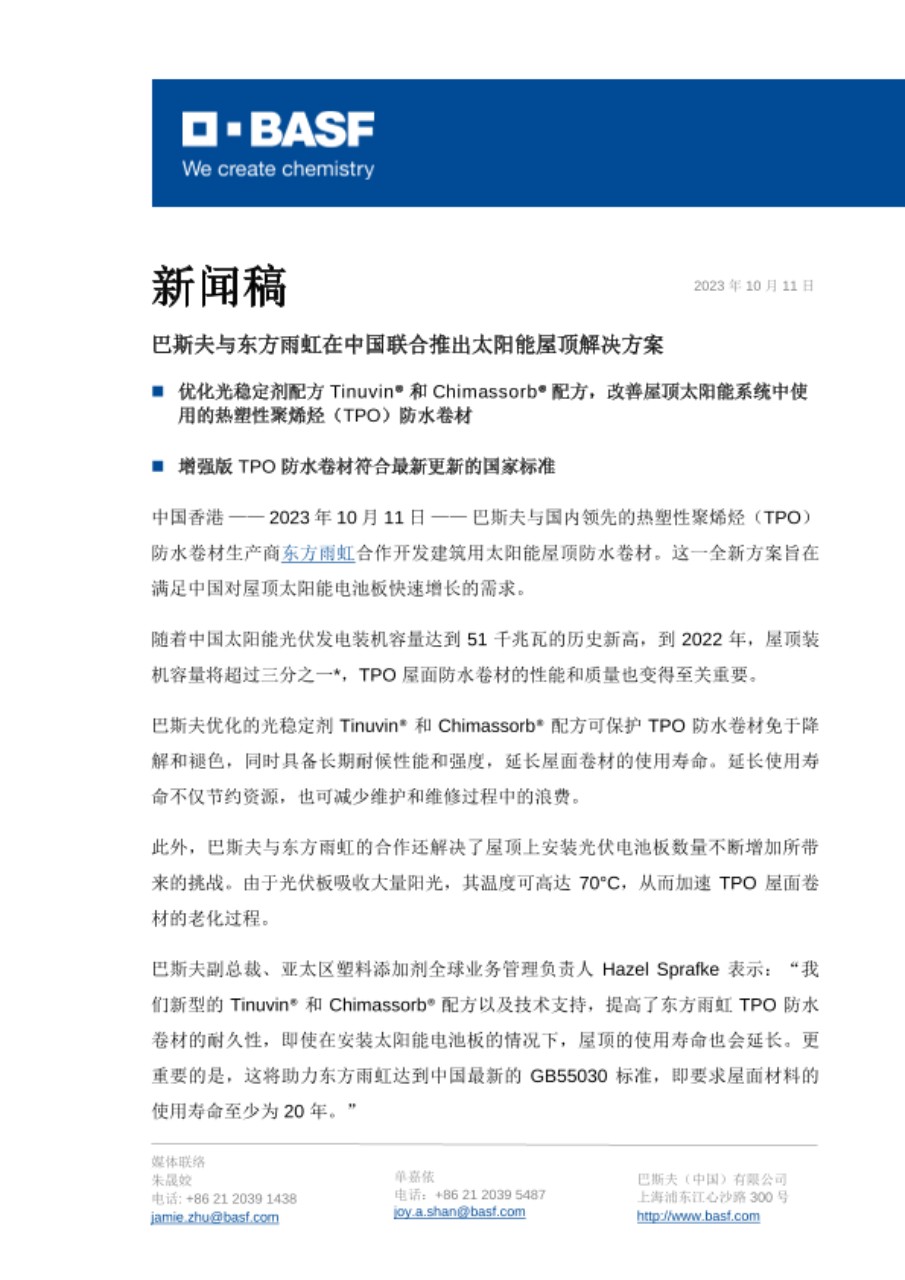 中国香港 —— 2023 年 10 月 11 日 —— 巴斯夫与国内领先的热塑性聚烯烃(TPO)防水卷材生产商东方雨虹合作开发建筑用太阳能屋顶防水卷材。这一全新方案旨在满足中国对屋顶太阳能电池板快速增长的需求。