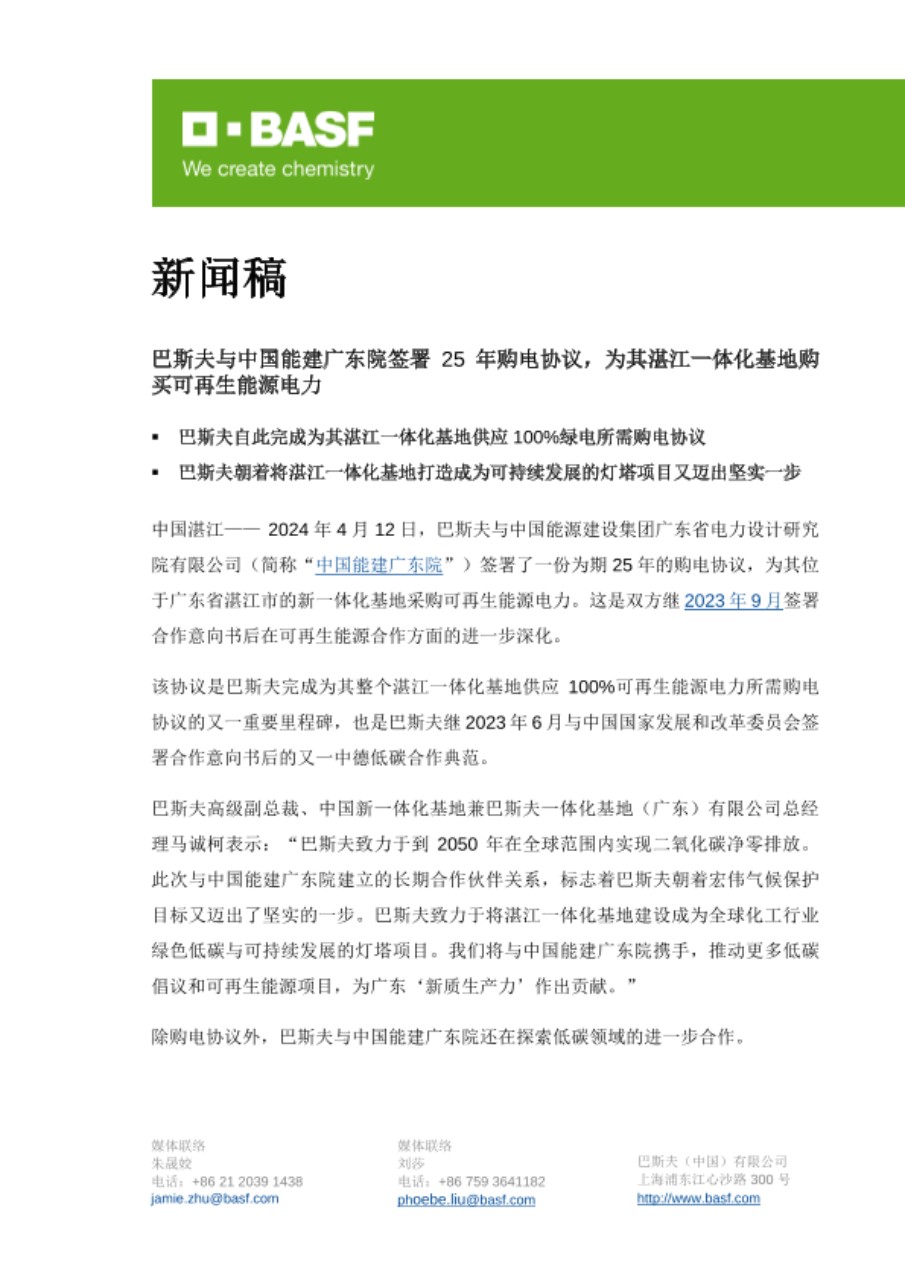 - 巴斯夫自此完成为其湛江一体化基地供应 100% 绿电所需购电协议