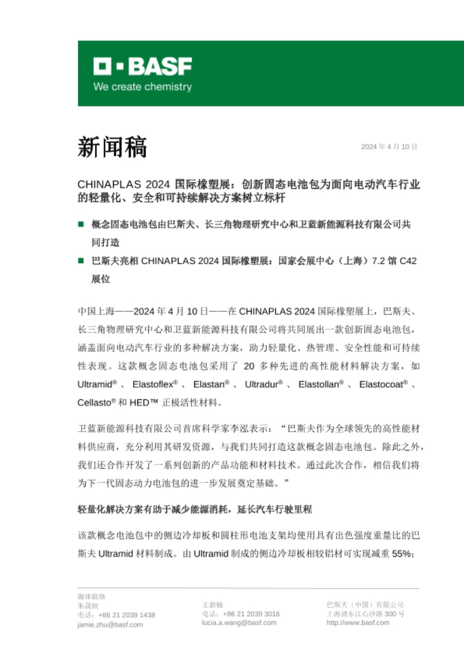 中国上海——2024 年 4 月 10 日——在 CHINAPLAS 2024 国际橡塑展上,巴斯夫、长三角物理研究中心和卫蓝新能源科技有限公司将共同展出一款创新固态电池包,涵盖面向电动汽车行业的多种解决方案,助力轻量化、热管理、安全性能和可持续性表现。这款概念固态电池包采用了 20 多种先进的高性能材料解决方案,如Ultramid®、Elastoflex®、Elastan®、Ultradur®、Elastollan®、Elastocoat®、Cellasto® 和 HED™ 正极活性材料。