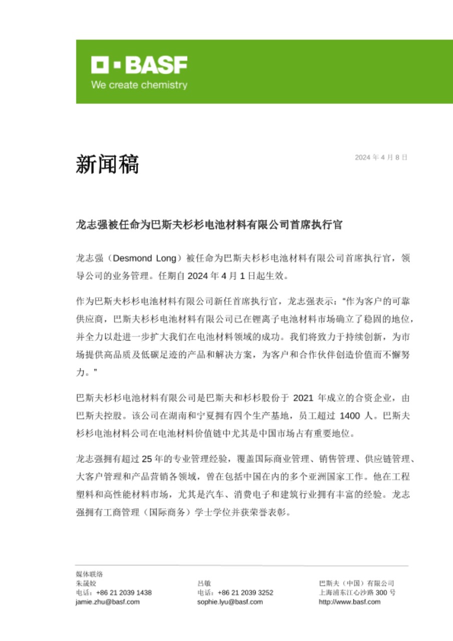 龙志强(Desmond Long)被任命为巴斯夫杉杉电池材料有限公司首席执行官,领导公司的业务管理。任期自2024年4月1日起生效。