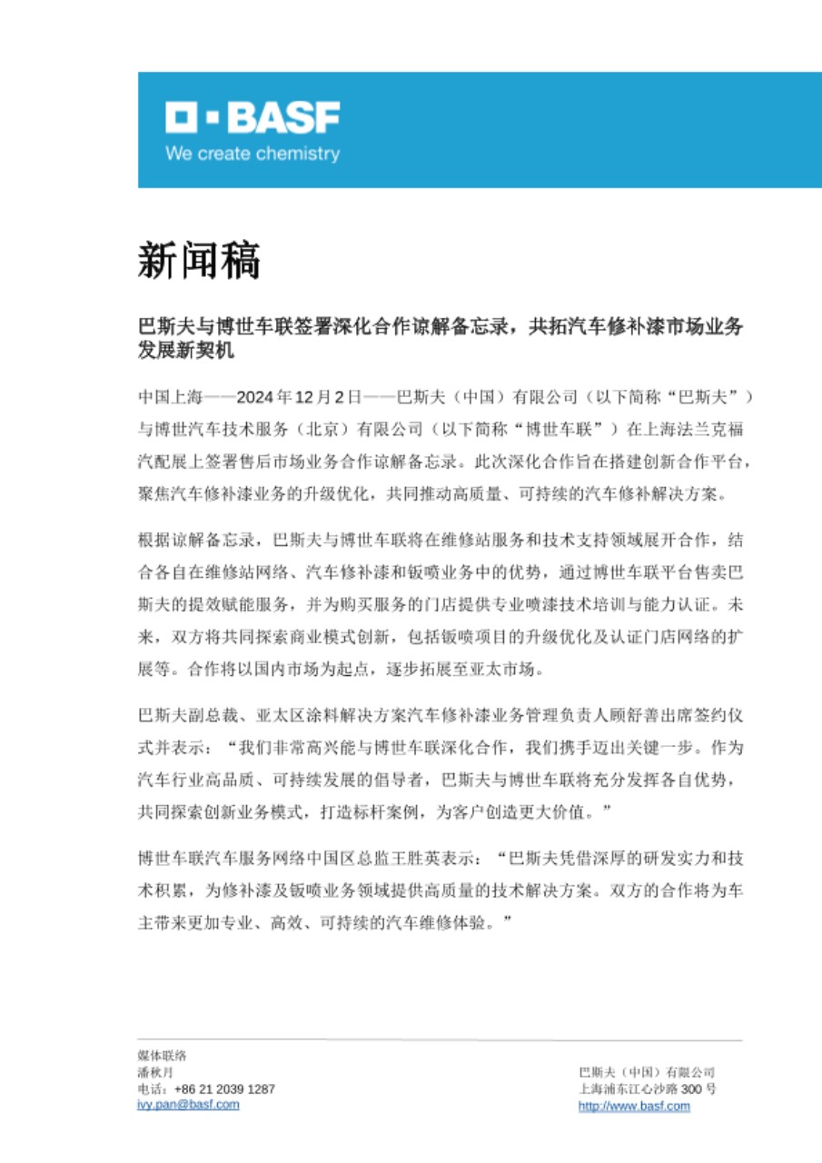 中国上海——2024年12月2日——巴斯夫(中国)有限公司(以下简称“巴斯夫”)与博世汽车技术服务(北京)有限公司(以下简称“博世车联”)在上海法兰克福汽配展上签署售后市场业务合作谅解备忘录。此次深化合作旨在搭建创新合作平台,聚焦汽车修补漆业务的升级优化,共同推动高质量、可持续的汽车修补解决方案。