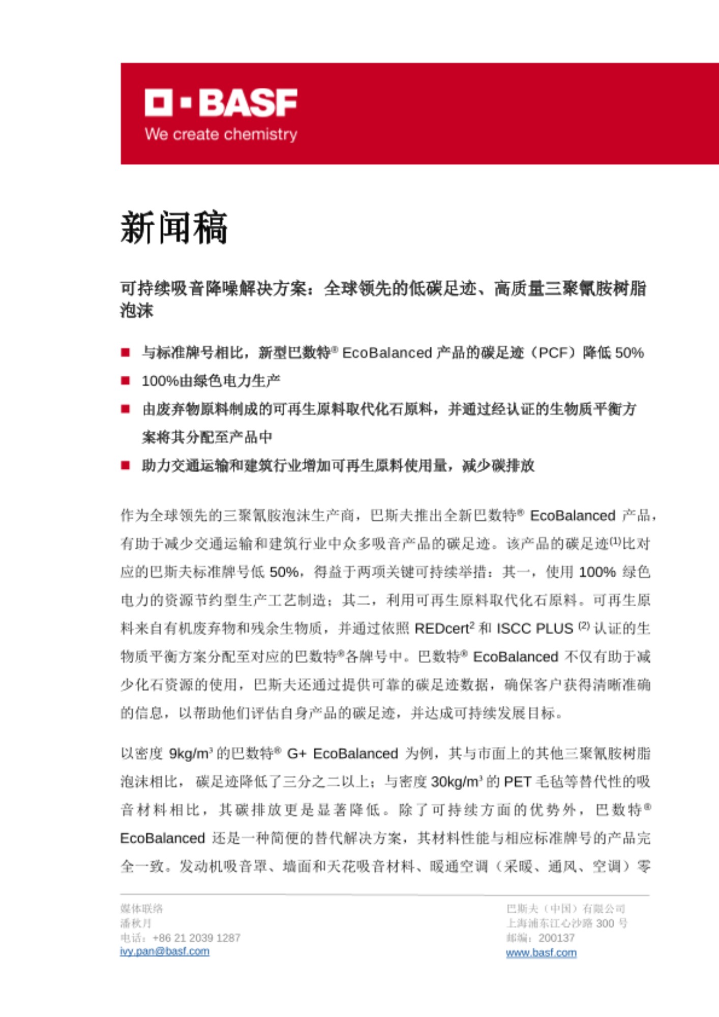 作为全球领先的三聚氰胺泡沫生产商,巴斯夫推出全新巴数特® EcoBalanced 产品,有助于减少交通运输和建筑行业中众多吸音产品的碳足迹。该产品的碳足迹(1)比对应的巴斯夫标准牌号低 50%,得益于两项关键可持续举措:其一,使用 100% 绿色电力的资源节约型生产工艺制造;其二,利用可再生原料取代化石原料。可再生原料来自有机废弃物和残余生物质,并通过依照 REDcert2 和 ISCC PLUS (2) 认证的生物质平衡方案分配至对应的巴数特®各牌号中。巴数特® EcoBalanced 不仅有助于减少化石资源的使用,巴斯夫还通过提供可靠的碳足迹数据,确保客户获得清晰准确的信息,以帮助他们评估自身产品的碳足迹,并达成可持续发展目标。