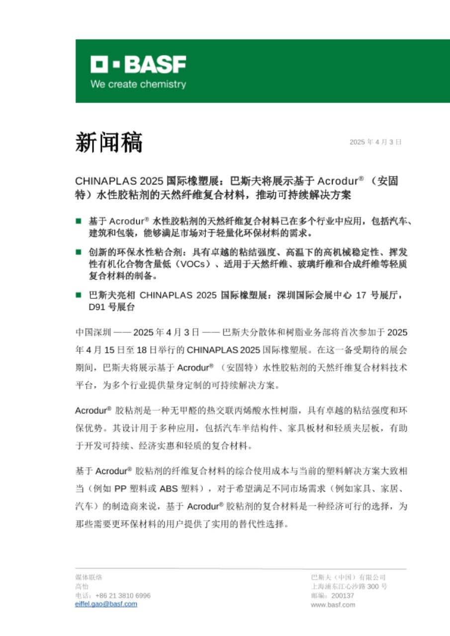 中国深圳 —— 2025 年 4 月 3 日 —— 巴斯夫分散体和树脂业务部将首次参加于 2025 年 4 月 15 日至 18 日举行的 CHINAPLAS 2025 国际橡塑展。在这一备受期待的展会期间,巴斯夫将展示基于 Acrodur® (安固特)水性胶粘剂的天然纤维复合材料技术平台,为多个行业提供量身定制的可持续解决方案。