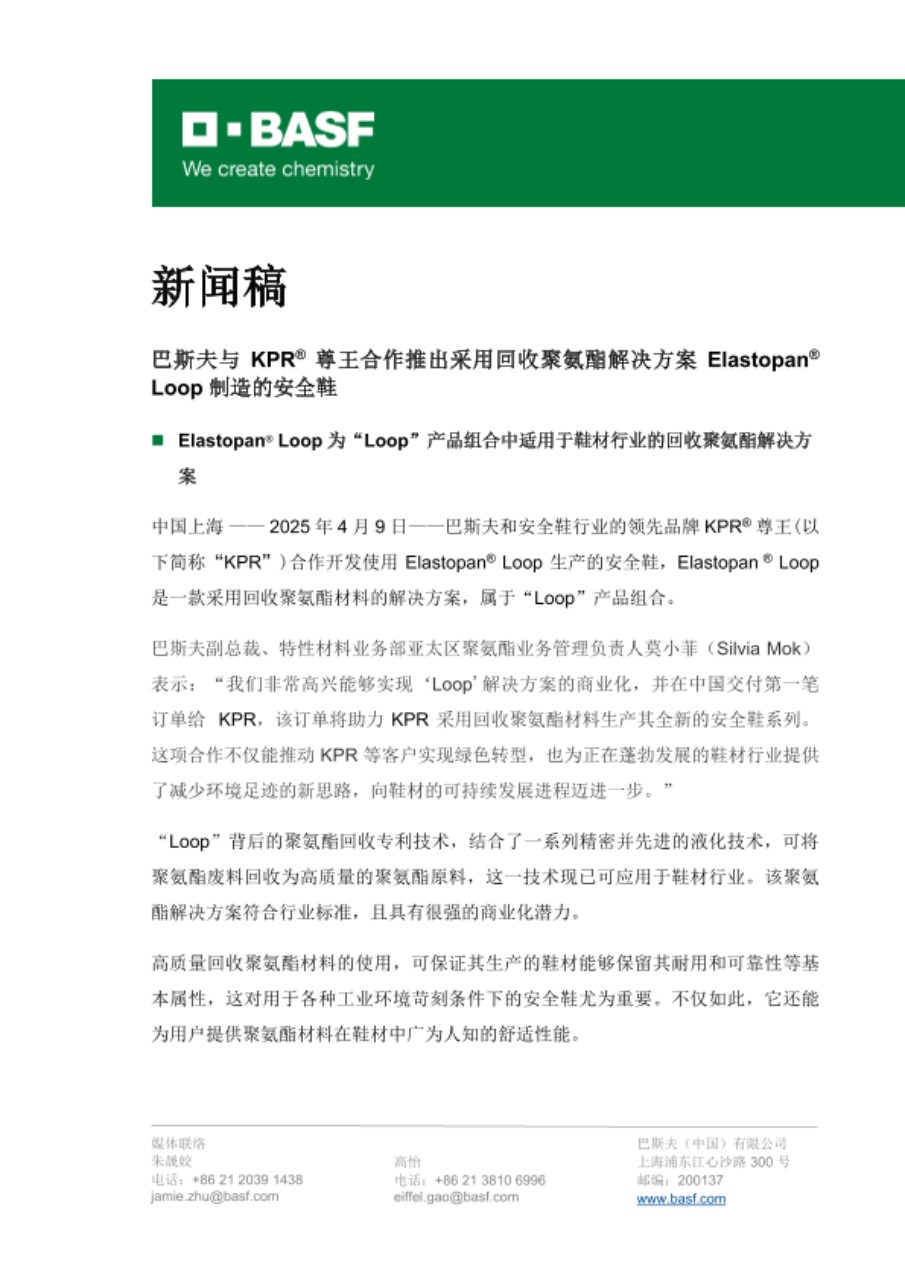 中国上海 —— 2025 年 4 月 9 日——巴斯夫和安全鞋行业的领先品牌 KPR® 尊王(以下简称“KPR”)合作开发使用 Elastopan® Loop 生产的安全鞋,Elastopan ® Loop 是一款采用回收聚氨酯材料的解决方案,属于“Loop”产品组合。