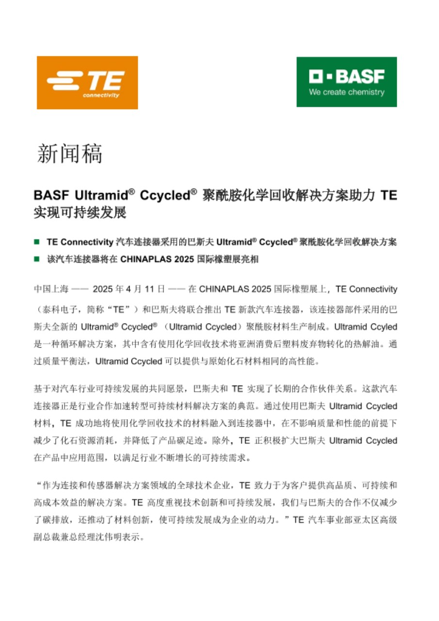 - TE Connectivity 汽车连接器采用的巴斯夫 Ultramid® Ccycled® 聚酰胺化学回收解决方案