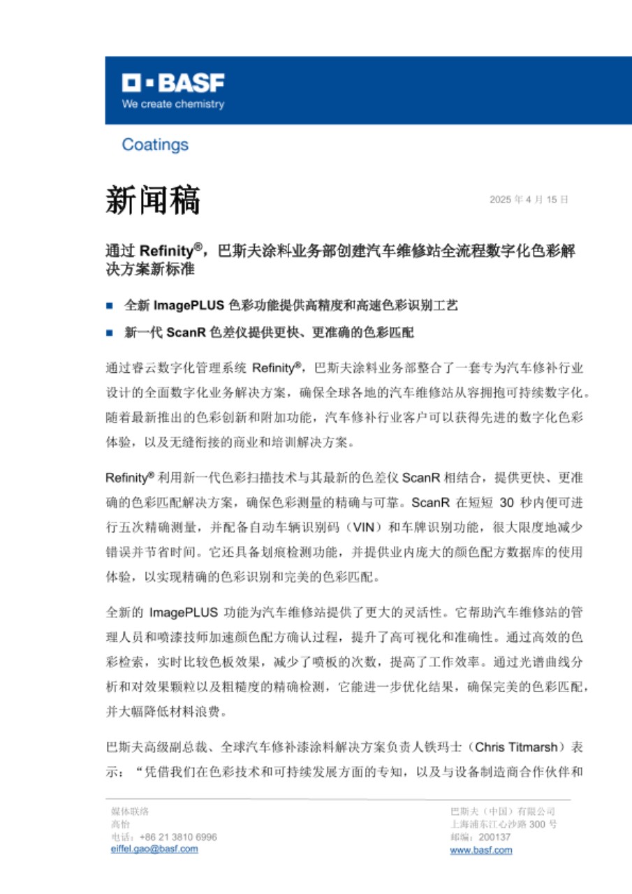 通过 Refinity®,巴斯夫涂料业务部创建汽车维修站全流程数字化色彩解决方案新标准