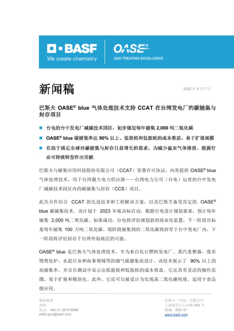 巴斯夫 OASE® blue 气体处理技术支持 CCAT 在台湾发电厂的碳捕集与封存项目