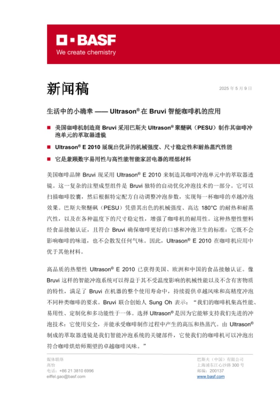 - 美国咖啡机制造商 Bruvi 采用巴斯夫 Ultrason® 聚醚砜(PESU)制作其咖啡冲泡单元的萃取器透镜