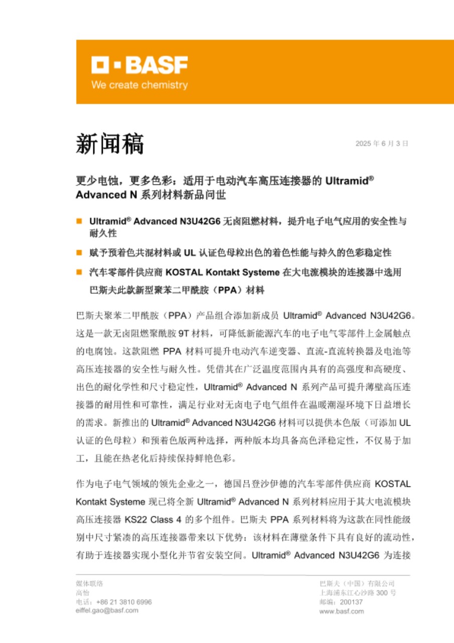 巴斯夫聚苯二甲酰胺(PPA)产品组合添加新成员 Ultramid® Advanced N3U42G6。这是一款无卤阻燃聚酰胺 9T 材料,可降低新能源汽车的电子电气零部件上金属触点的电腐蚀。这款阻燃 PPA 材料可提升电动汽车逆变器、直流-直流转换器及电池等高压连接器的安全性与耐久性。凭借其在广泛温度范围内具有的高强度和高硬度、出色的耐化学性和尺寸稳定性,Ultramid® Advanced N 系列产品可提升薄壁高压连接器的耐用性和可靠性,满足行业对无卤电子电气组件在温暖潮湿环境下日益增长的需求。新推出的 Ultramid® Advanced N3U42G6 材料可以提供本色版(可添加 UL 认证的色母粒)和预着色版两种选择,两种版本均具备高色泽稳定性,不仅易于加工,且能在热老化后持续保持鲜艳色彩。