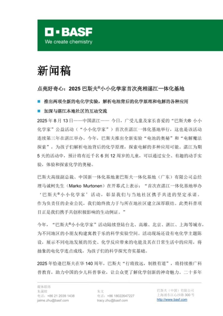 2025 年恰逢巴斯夫在华 140 周年,巴斯夫“行将致远,制胜有道”,将持续推广科普教育,助力中国的少儿科普事业,让公众更了解化学创新的神奇魅力。二十多年来,巴斯夫每年在国内举办“小小化学家”活动,为超过 21 万名学龄儿童创造了集科学性、趣味性、知识性于一体的探索课堂。
