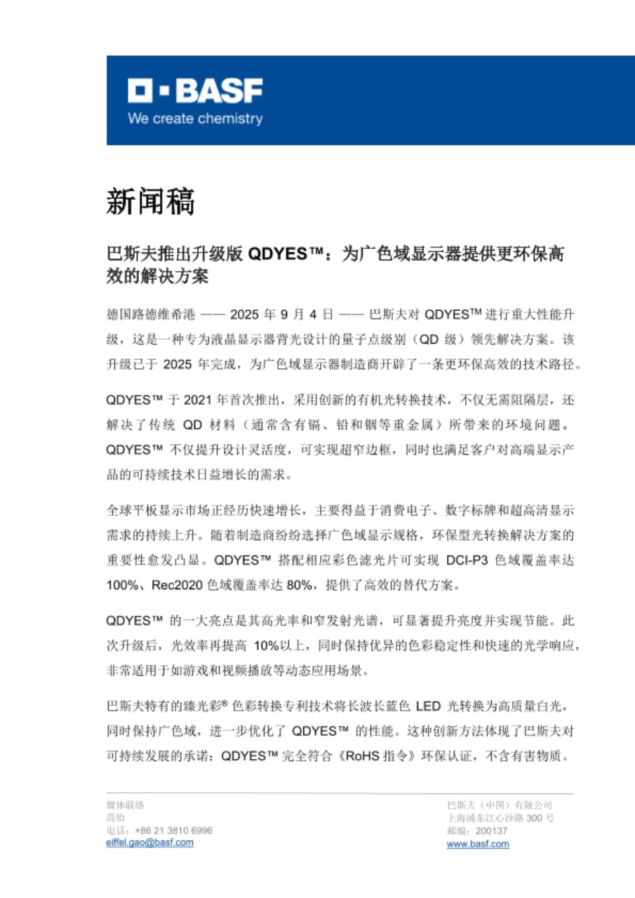 德国路德维希港 —— 2025 年 9 月 4 日 —— 巴斯夫对 QDYESTM 进行重大性能升级,这是一种专为液晶显示器背光设计的量子点级别(QD 级)领先解决方案。该升级已于 2025 年完成,为广色域显示器制造商开辟了一条更环保高效的技术路径。