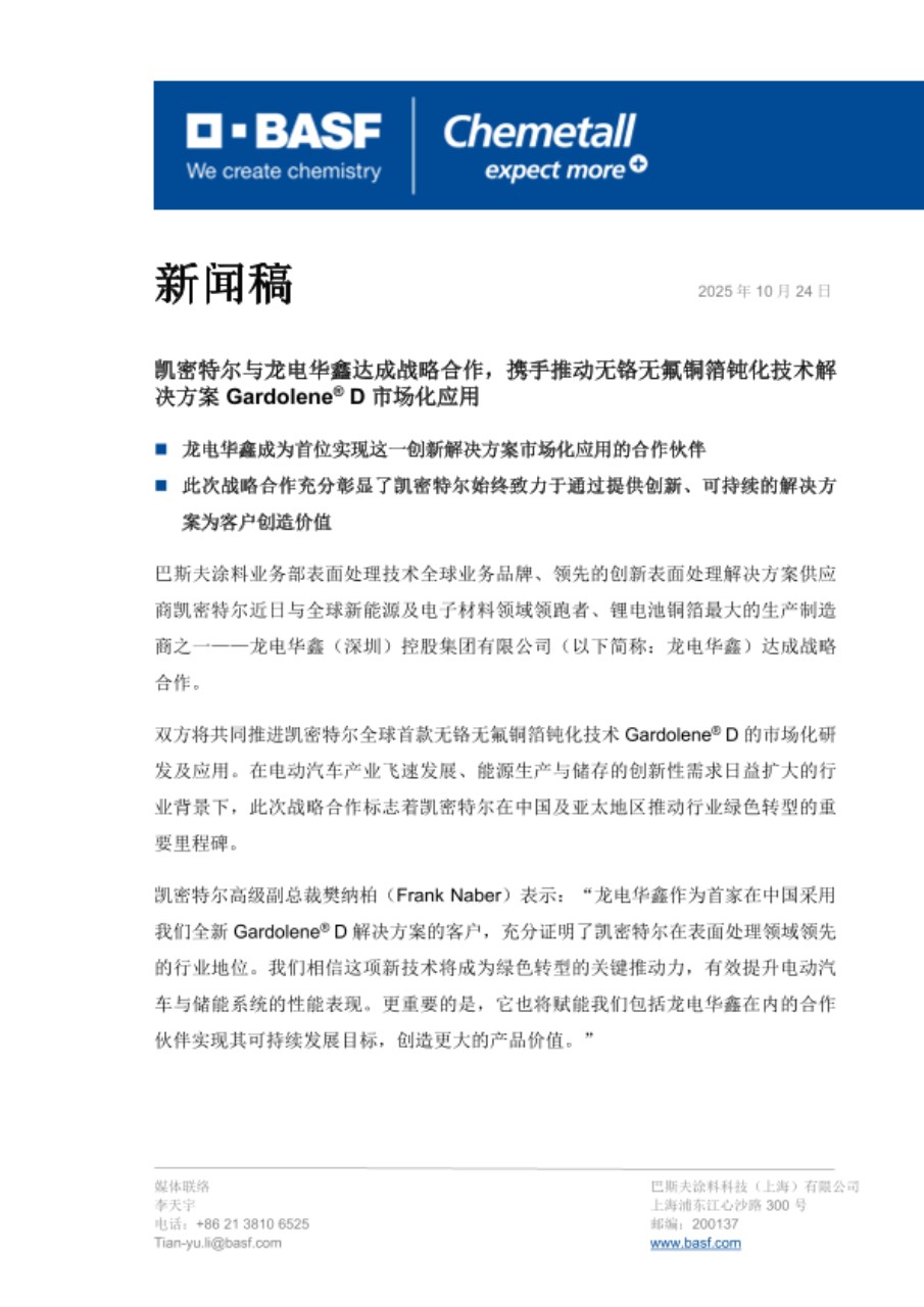 巴斯夫涂料业务部表面处理技术全球业务品牌、领先的创新表面处理解决方案供应商凯密特尔近日与全球新能源及电子材料领域领跑者、锂电池铜箔最大的生产制造商之一——龙电华鑫(深圳)控股集团有限公司(以下简称:龙电华鑫)达成战略合作。