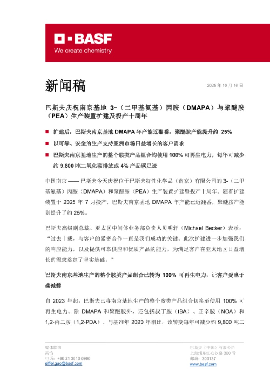 中国南京 —— 巴斯夫今天庆祝位于巴斯夫特性化学品(南京)有限公司的 3-(二甲基氨基)丙胺(DMAPA)和聚醚胺(PEA)生产装置扩建暨投产十周年。随着扩建装置于 2025 年 7 月投产,巴斯夫南京基地 DMAPA 年产能已近翻番,聚醚胺产能则提升了约 25%。