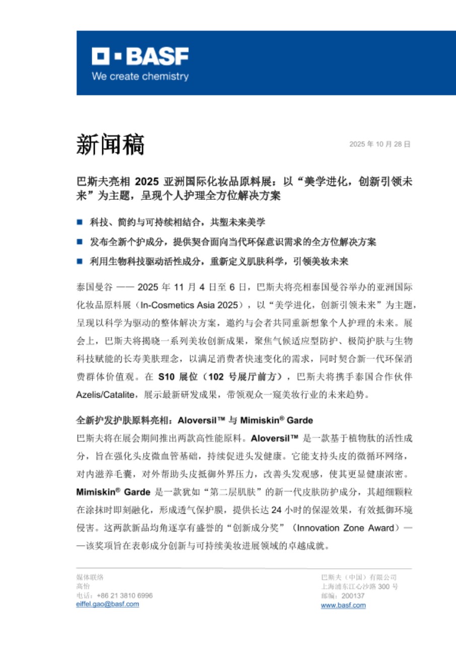 巴斯夫亮相 2025 亚洲国际化妆品原料展:以“美学进化,创新引领未来”为主题,呈现个人护理全方位解决方案