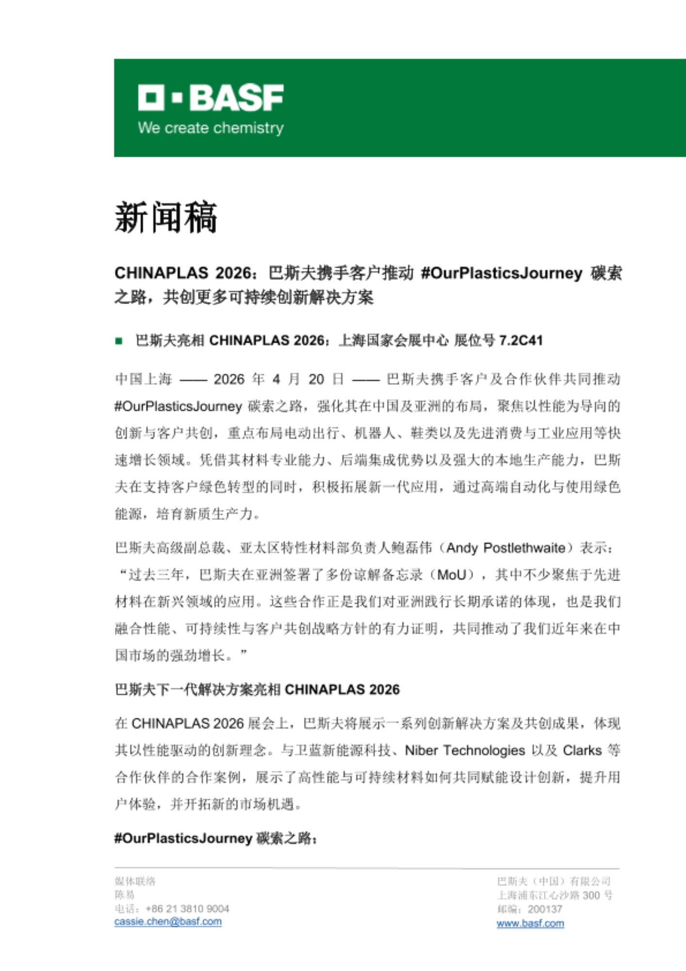 - 巴斯夫亮相 CHINAPLAS 2026:上海国家会展中心 展位号7.2C41