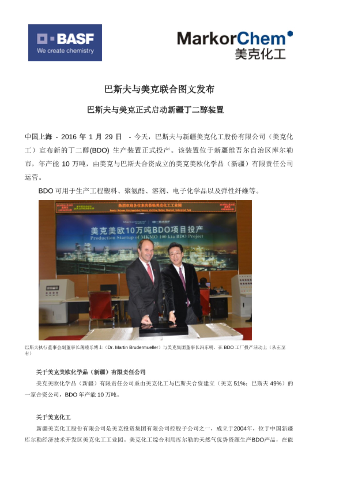 中国上海 - 2016年1月29日 - 今天,巴斯夫与新疆美克化工股份有限公司(美克化工)宣布新的丁二醇(BDO) 生产装置正式投产。该装置位于新疆维吾尔自治区库尔勒市,年产能10万吨,由美克与巴斯夫合资成立的美克美欧化学品(新疆)有限责任公司运营。