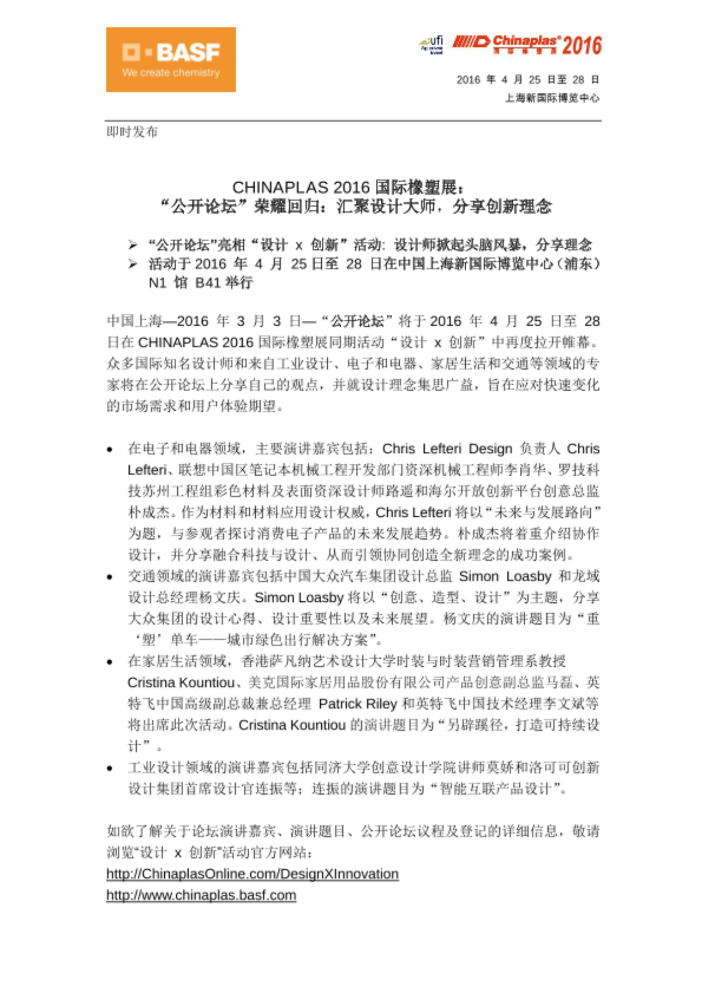 中国上海—2016 年 3 月 3 日—“公开论坛”将于2016 年 4 月 25 日至 28 日在CHINAPLAS 2016国际橡塑展同期活动“设计 x 创新”中再度拉开帷幕。众多国际知名设计师和来自工业设计、电子和电器、家居生活和交通等领域的专家将在公开论坛上分享自己的观点,并就设计理念集思广益,旨在应对快速变化的市场需求和用户体验期望。