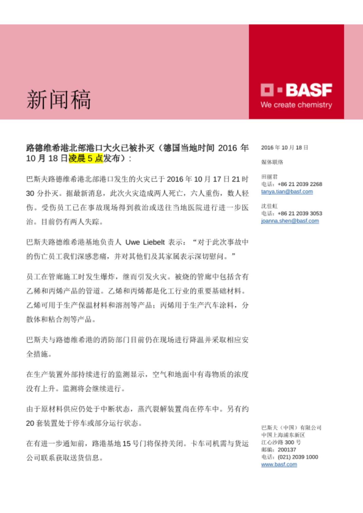 巴斯夫路德维希港北部港口发生的火灾已于2016年10月17日21时30分扑灭。据最新消息,此次火灾造成两人死亡,六人重伤,数人轻伤。受伤员工已在事故现场得到救治或送往当地医院进行进一步医治。目前仍有两人失踪。