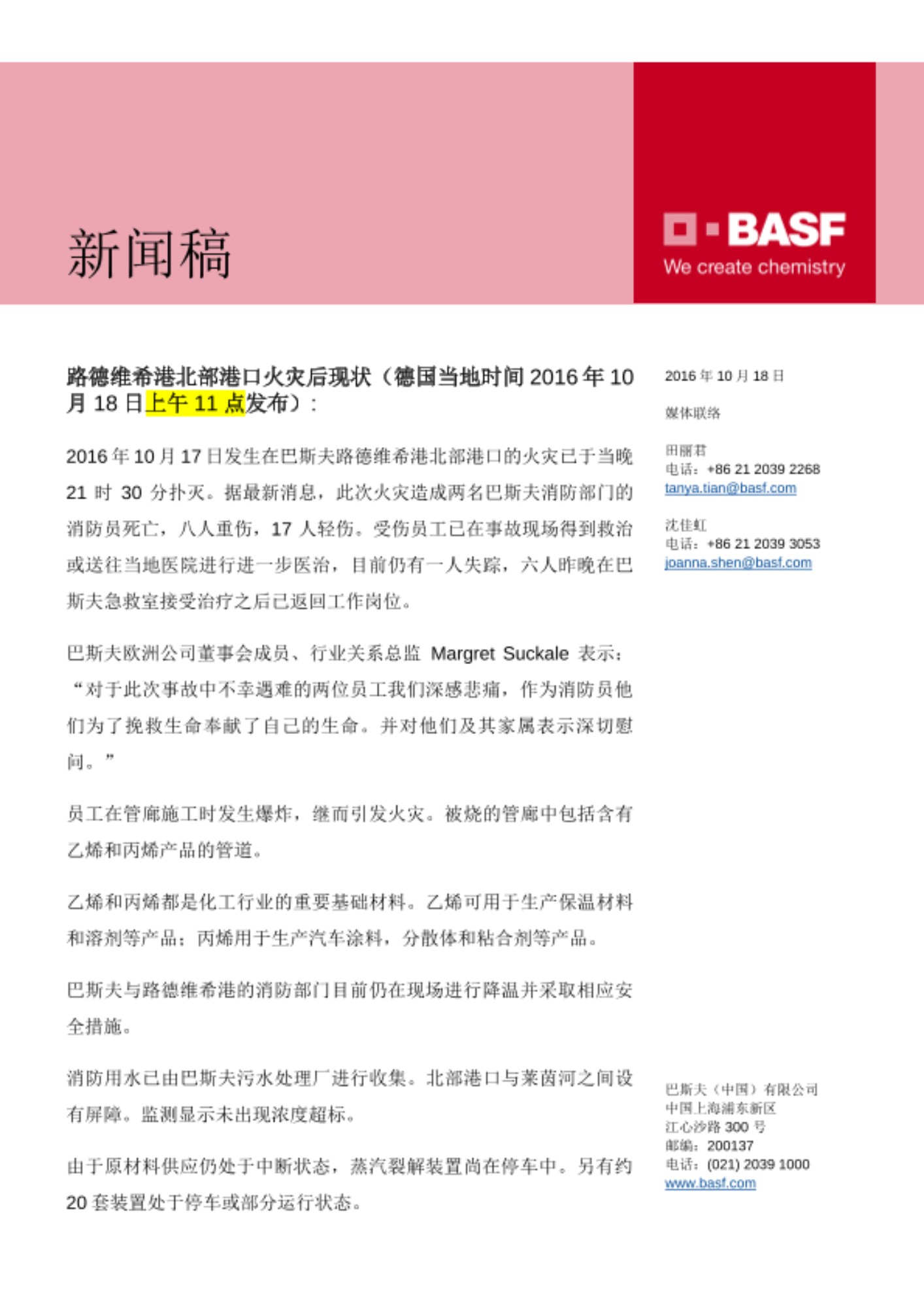 巴斯夫将积极配合有关部门,对事故原因进行调查。