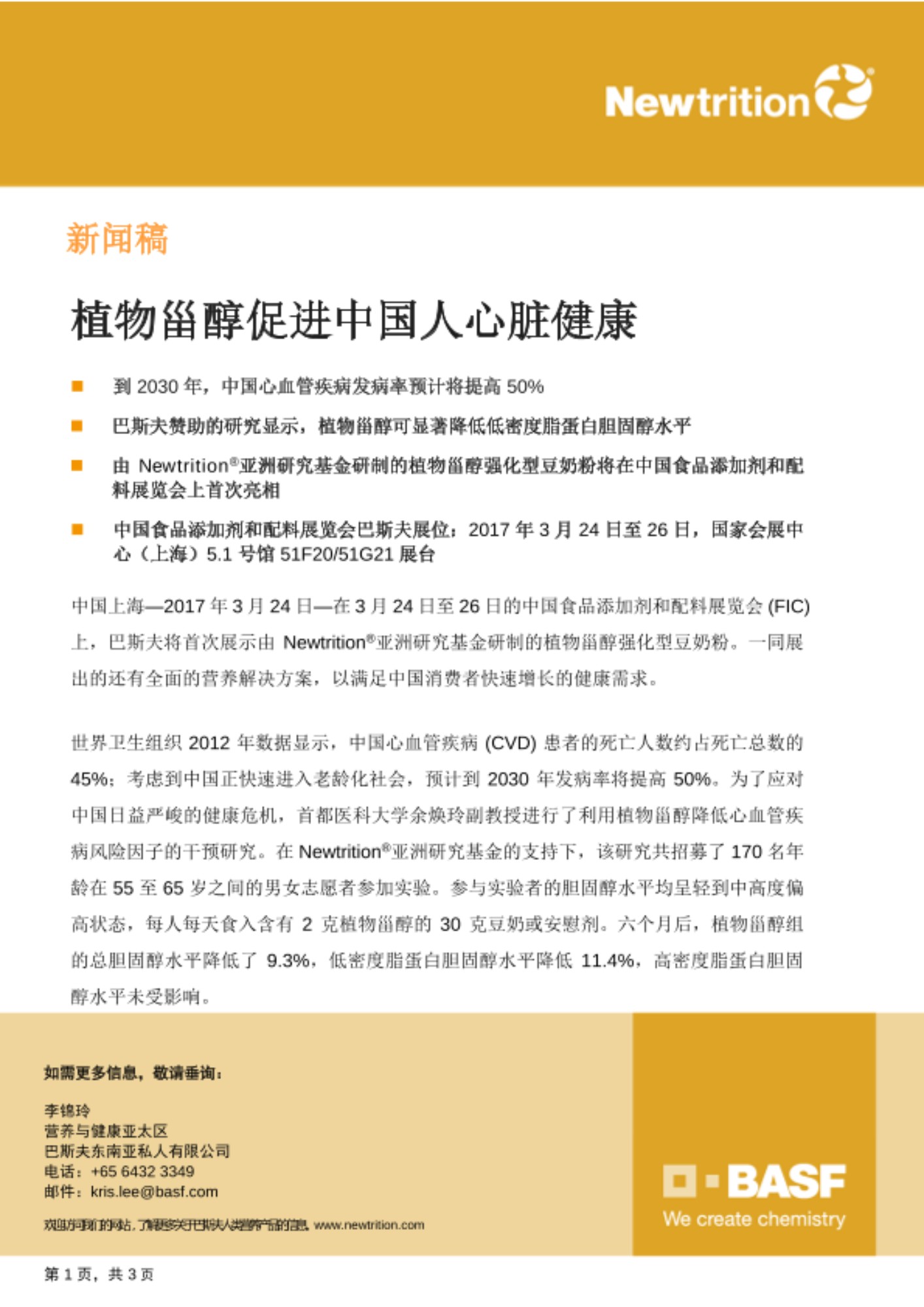 中国上海—2017 年 3 月 24 日—在 3 月 24 日至 26 日的中国食品添加剂和配料展览会 (FIC) 上,巴斯夫将首次展示由 Newtrition®亚洲研究基金研制的植物甾醇强化型豆奶粉。一同展出的还有全面的营养解决方案,以满足中国消费者快速增长的健康需求。